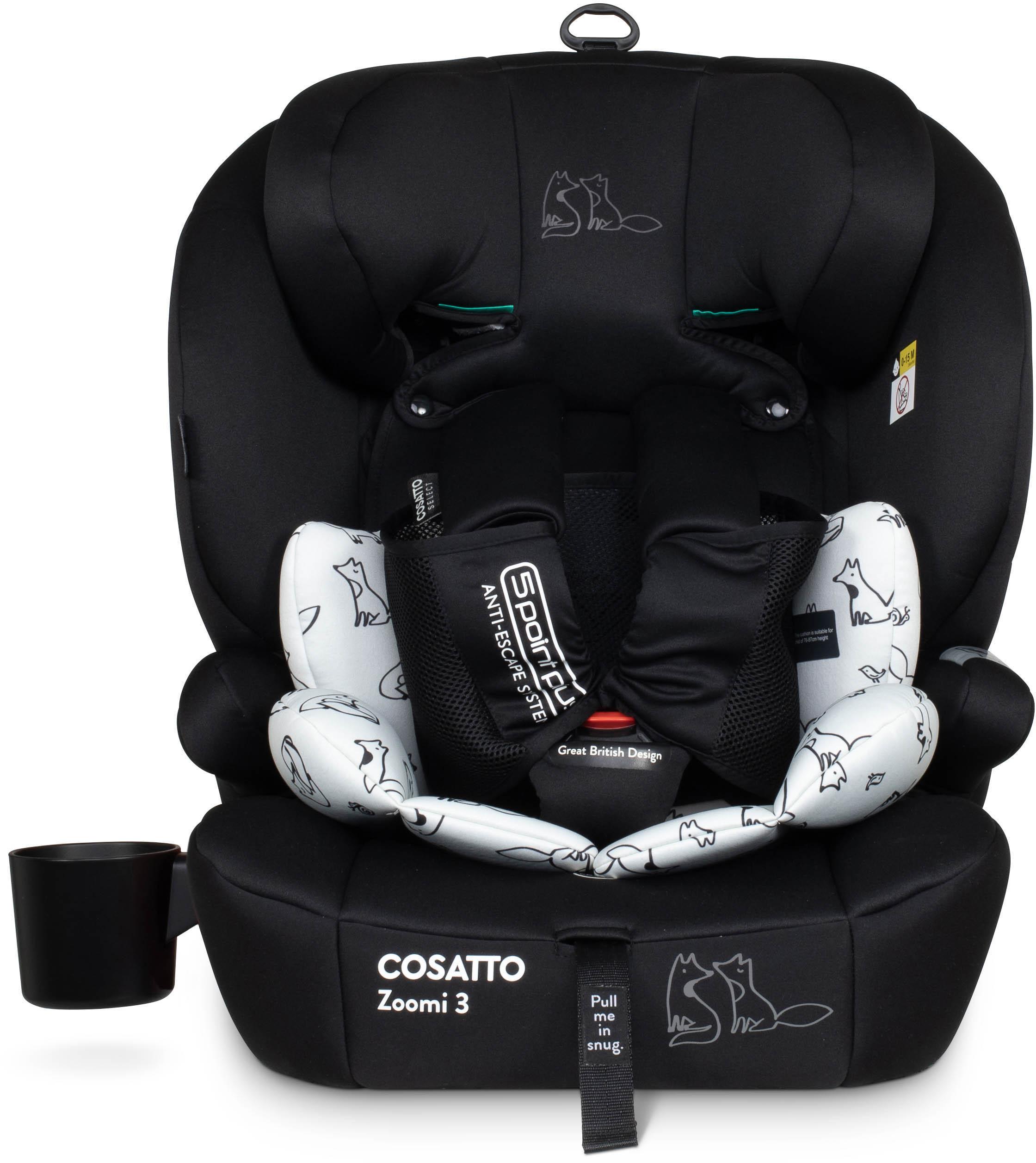Cosatto Zoomi 3 i-Size car seat has ISOFIX fittings (an attachment system that uses metal anchor points built into the chassis of the car) and a top-tether ensuring a secure fit. It has a five-point safety harness offering extra safety in the event of a collision by distributing forces over the strongest parts of the body. The harness is tested to a higher child weight of 20kg to grow with your child for extended safety. This seat also features side impact protection with shock absorbing memory foam, deep side wings and a thick padded head restraint. It also includes tummy pad, chest pads and comfy padded arm rests.