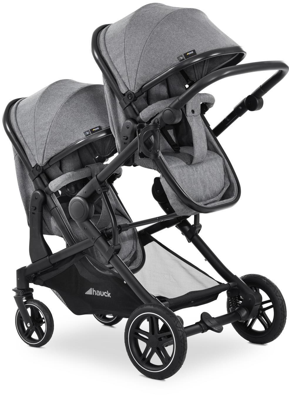 On cold days, you can combine the seat inserts and pram covers into warm footmuffs. The padded 5-point harnesses and the removable bumper bars with anti-slip protection help keep your children safe. On rainy days, you can use the included rain cover.