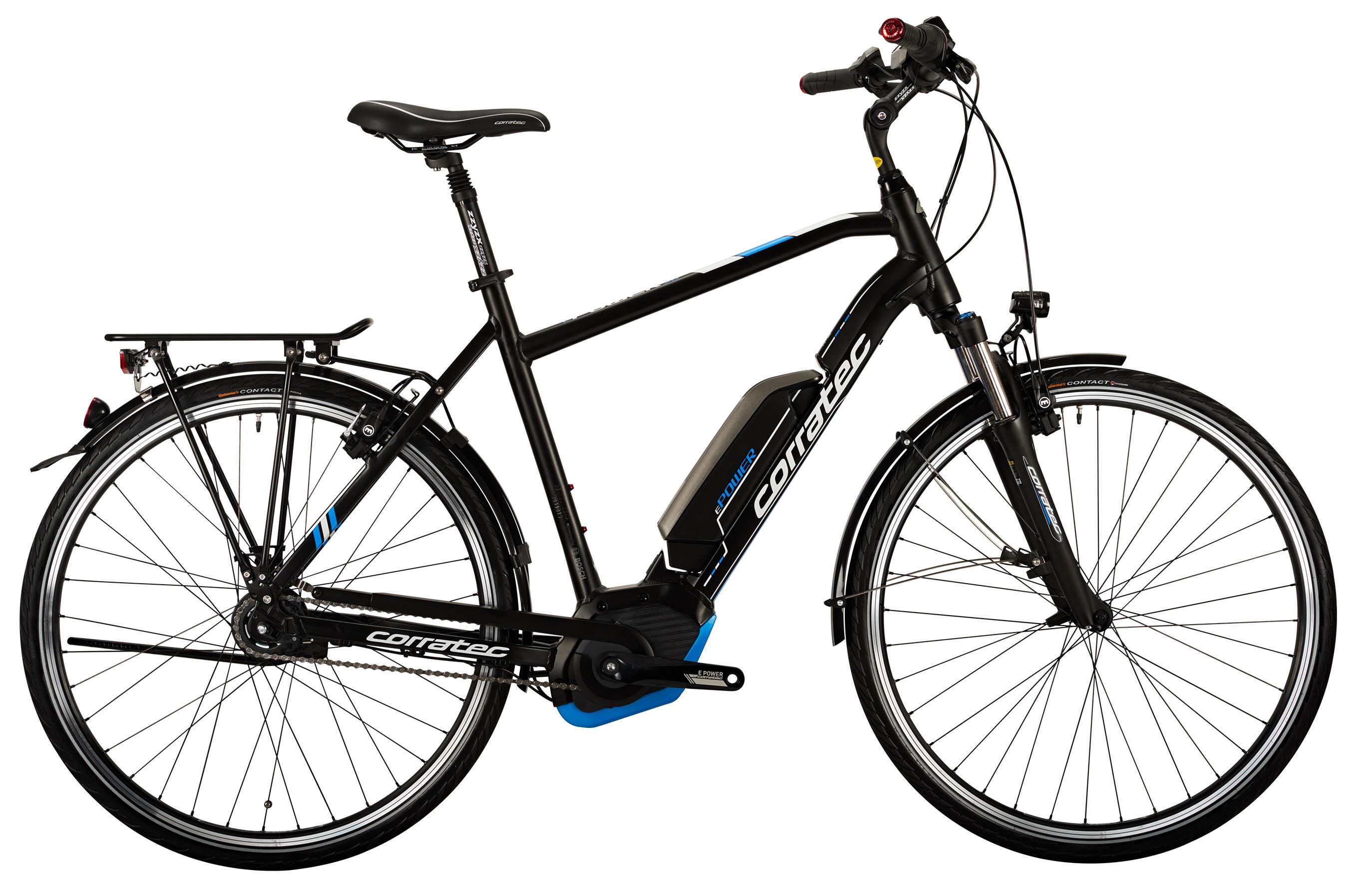 The Corratec E-Power Active 8 400 Mens Electric Hybrid Bike is the perfect e-bike for city commuting or countryside leisure rides. It has a traditional roadster style frame made from triple butted aluminium with 700c wheels, and delivers a sturdy but comfortable riding position.he Bosch Active centre drive motor system is paired with a Bosch 400wh battery that has a range of up to 75 miles dependent on terrain/mode, and charges from flat in as little as 2 ½ hours.