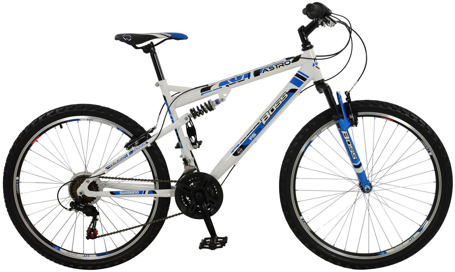 The Boss Astro Full Suspension Mountain Bike is fitted with top of the range Shimano 18 speed gears to take care of the transmission, controlled by Twist grip Microshifters. Wheels now feature stronger double wall alloy rims with machined braking surfaces for increased stopping power, and other well thought out details includes 26 x 1.95″ MTB tyres and a colour coded Boss saddle and gel grips for improved comfort on long rides.