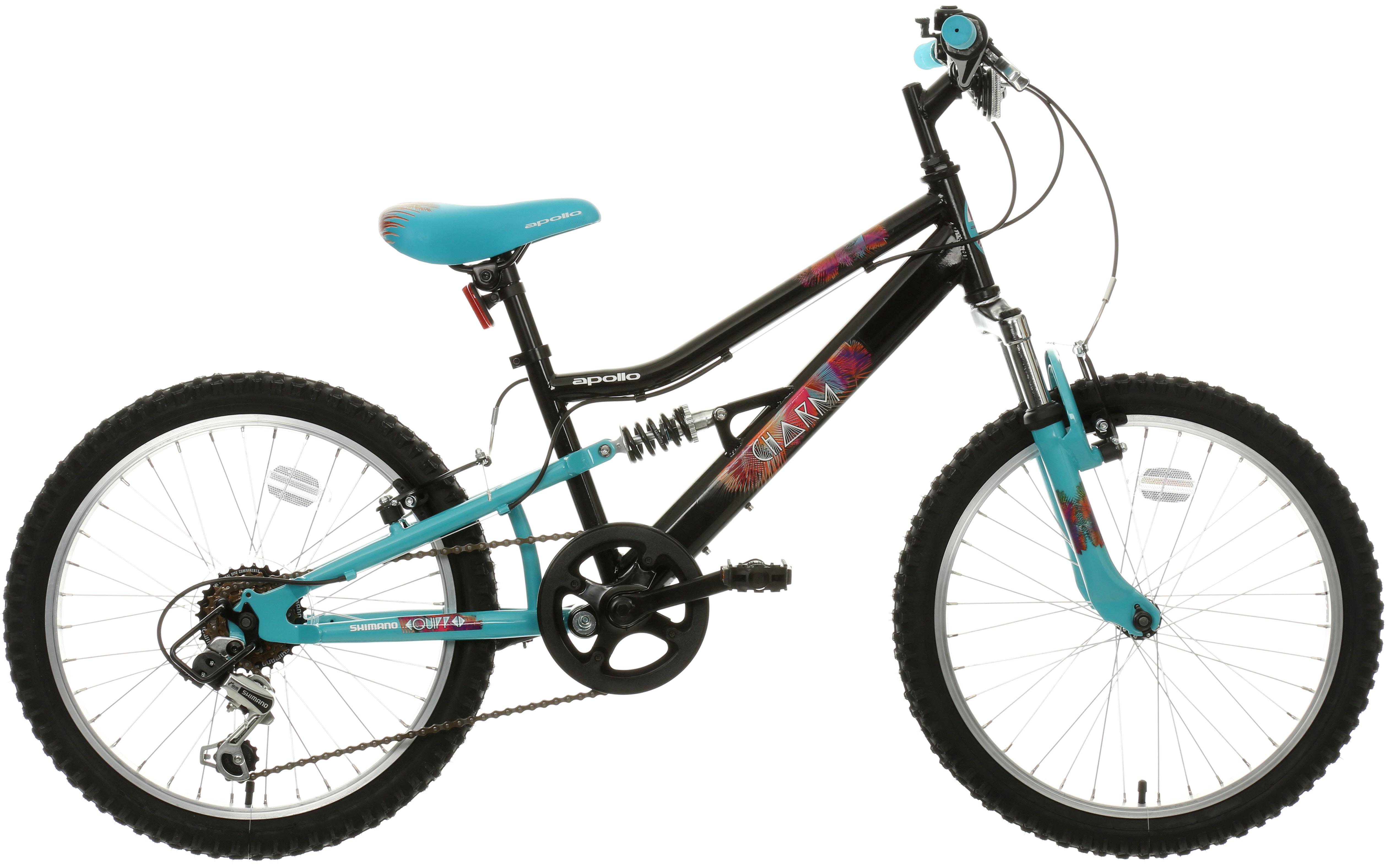 With a pretty design on a black frame, the Apollo Charm Junior Mountain Bike not only looks great, it also offers a brilliant ride, with full suspension so you can race over the bumps and not notice a thing, and with 6 speed gearing that helps get you speeding along in not time.
