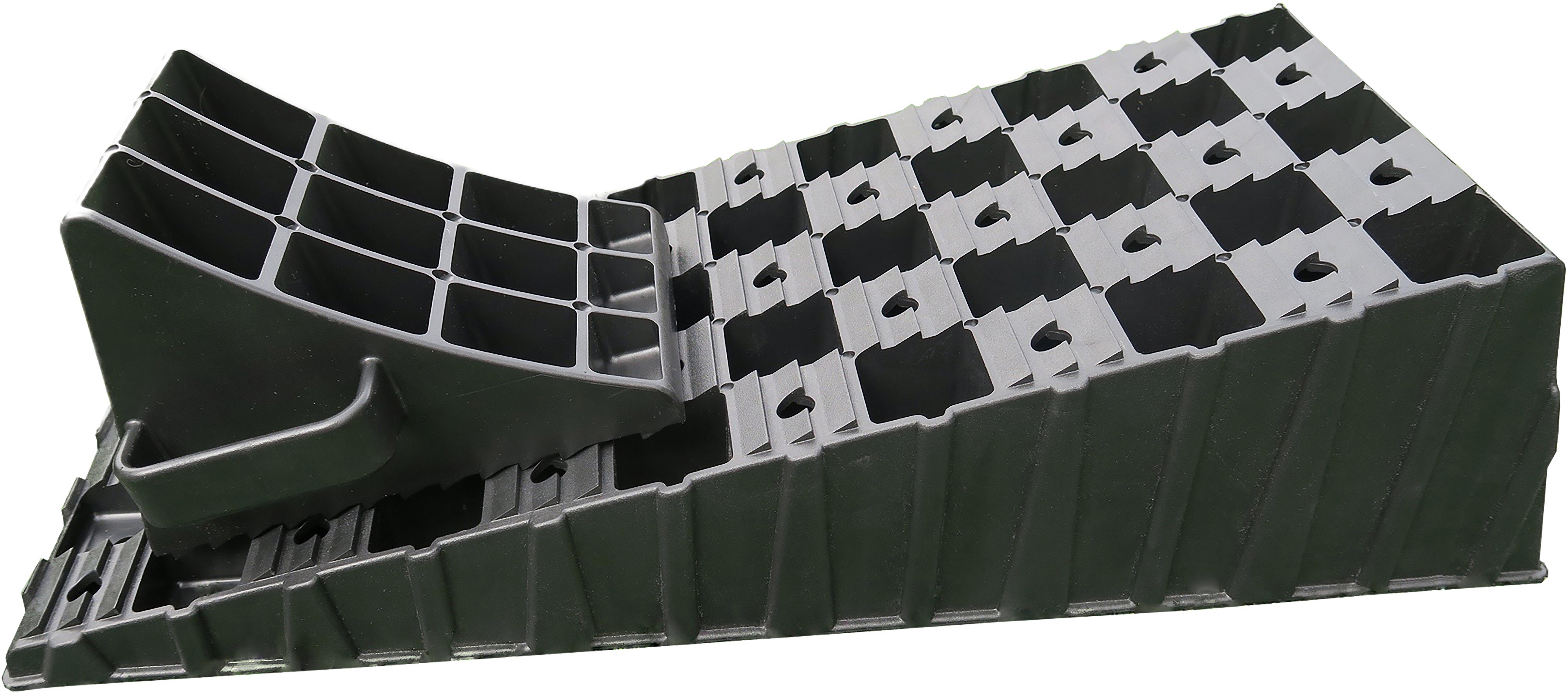 Levellers and wheel chocks can be made from different materials and shapes. Depending on the ground in question, you might need only a small leveller, or you might need the biggest leveller you can get your hands on!