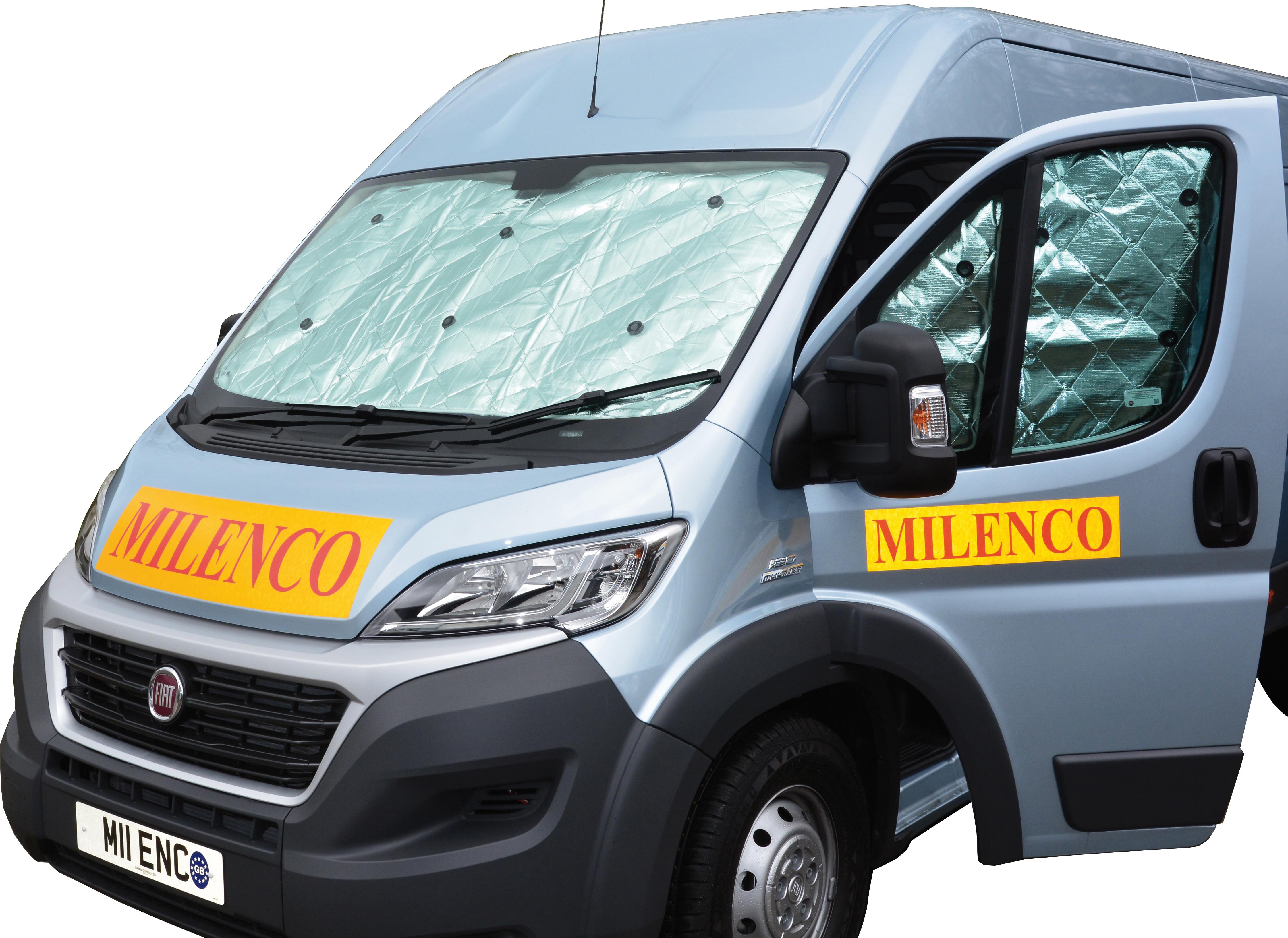 This is a uniquely designed one size fits all Internal Thermal Blind (Registered Design) This Blind comes with high quality sucker pads with their own handles and because they are black they won't let any distracting light through, so you get a good night sleep! Superior quality 7 ply construction (see image below) Extreme tested to -20 + 50 degrees C. Unique design easy release sucker pads. Contains 1 front and 2 side blinds. High thermal performance cool in summer and warm in winter. Designed to fit all chassis cabs, including Fiat Ducato, Ford Transit, Mercedes Sprinter and Vito, Peugeot Boxer, Renault Master and VW Transporter.