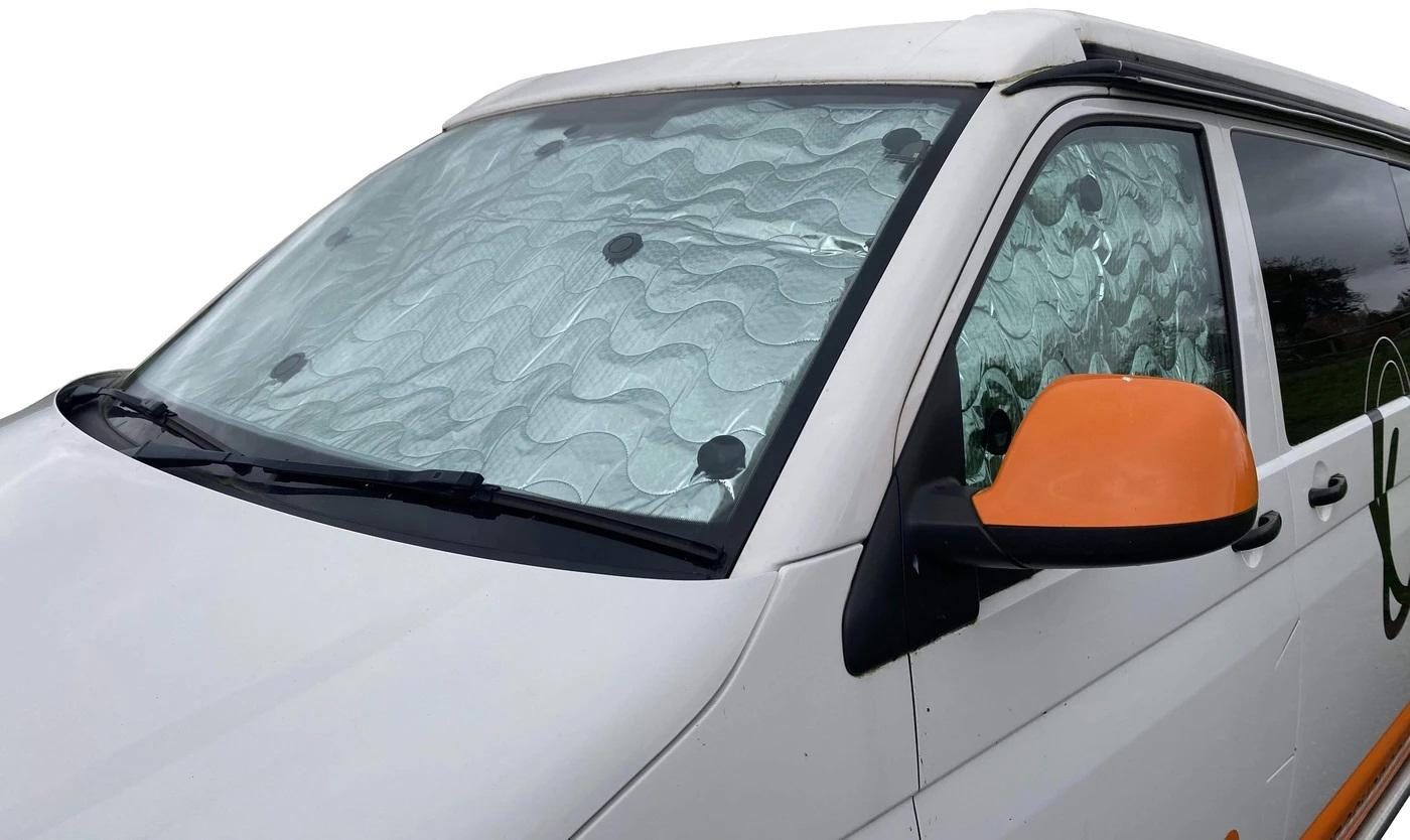 Olpro Internal Thermal Blind Set tailored for VW T5 and T6 Transporter Campervans and Vans , Three piece set to cover front windscreen and the two front cab side windows. Easily fitted with suction cups provided. Perfected for privacy and will cool the campervan in hot weather and  keep it warm in cold weather ( tested from -20°c to +50°c )