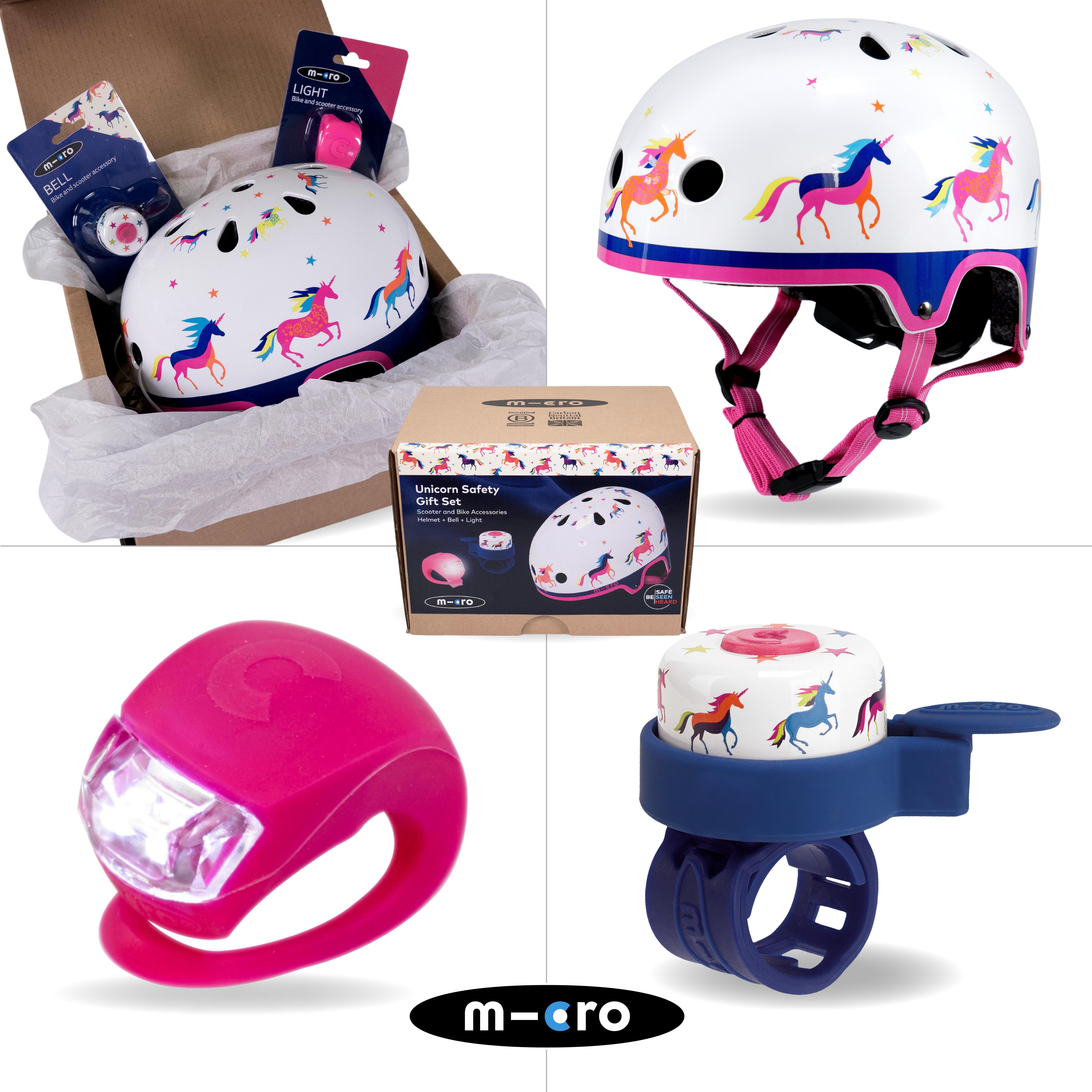 The set includes an award-winning Micro Small helmet (48-54cm) with adjustable chin straps, air vents to keep heads cool, a rear sizing dial for the perfect fit, a magnetic clasp for pinch-free opening and closing, LED rear light for extra safety and extra padding for a comfy fit.