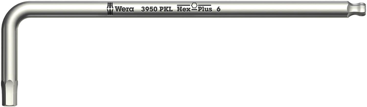 High quality L-keys made out of stainless steel for hexagonal socket screws by Wera. Stainless steel prevents the formation of extraneous rust. The Hex-Plus profile offers a larger contact surface within the screw head. This reduces the notching effects to a minimum and almost eliminates the risk of destroying the screw recess. Hexagonal ballpoint end on the long arm: the ballpoint drive profile means that it is possible to swivel the tool axis away from the screwdriving axis, thus enabling "round the corner" screwdriving.