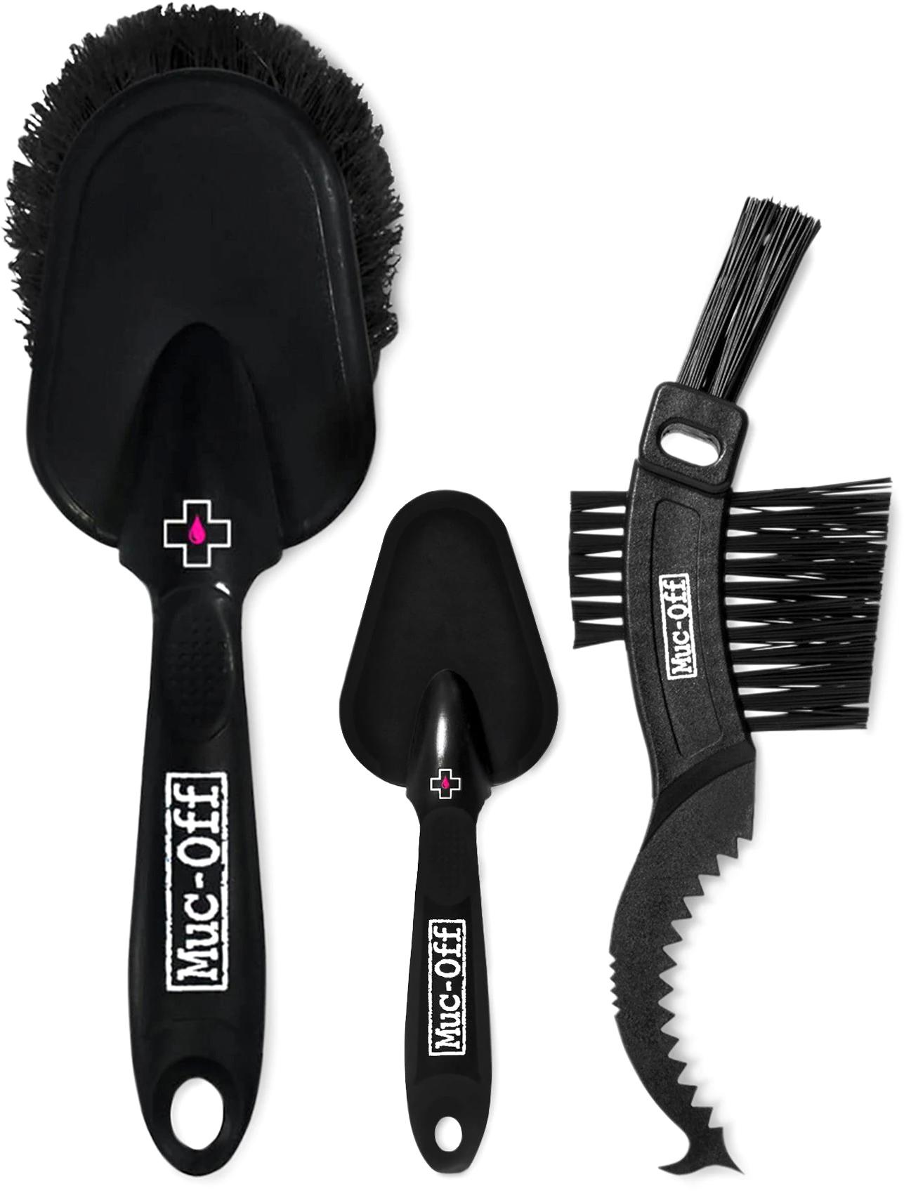 The Muc-Off 3 x Brush Set is a perfect gift for the keen cyclist in your life! It contains a Soft Washing Brush, Detailing Brush & Claw Brush. The soft washing brush features a sintered bristle compound that's designed to clean your wheels and components while caring for delicate finishes. Its new design has a tough, impact resistant handle that won't slip in extreme conditions, an oversized head for fast cleaning of large areas and rubberised impact zones for maximum protection. The Detailing Brush is ideal for reaching hard-to-shift dirt. Its all new design features a tough, impact resistant handle that won't slip in extreme conditions, durable nylon bristles and rubberised impact zones for maximum protection on delicate finishes. The Claw Brush features high quality construction with triple brush heads with tough nylon bristles and an integral scraper.