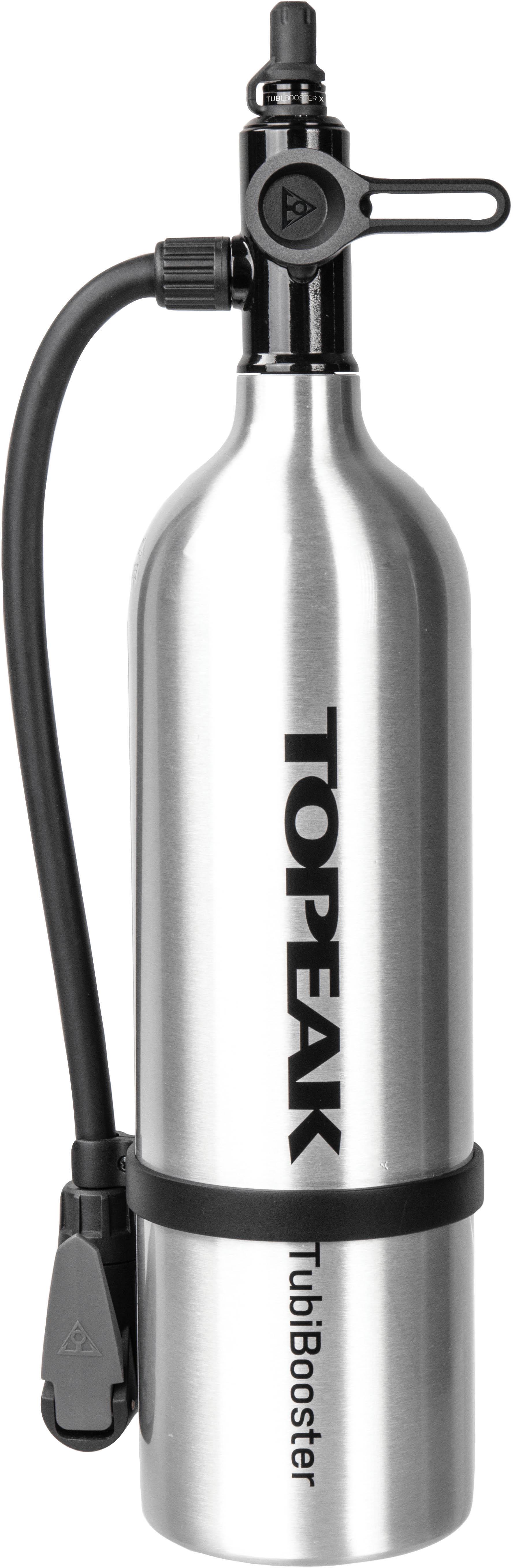 An aluminium air chamber with inflator head that stores an air charge of one litre, up to 200 psi / 14 bar. Works with a floor pump to quickly fill your tires and ensures proper installation on a tubeless rim at home. Once you flip the selector from “CHARGE” to “INFLATE” mode, air bypasses the chamber as you use the floor pump to inflate your tire to the perfect pressure. An integrated flexible hose with pump head works with Presta and Schrader valves and takes stress off the valve stem while pumping.
