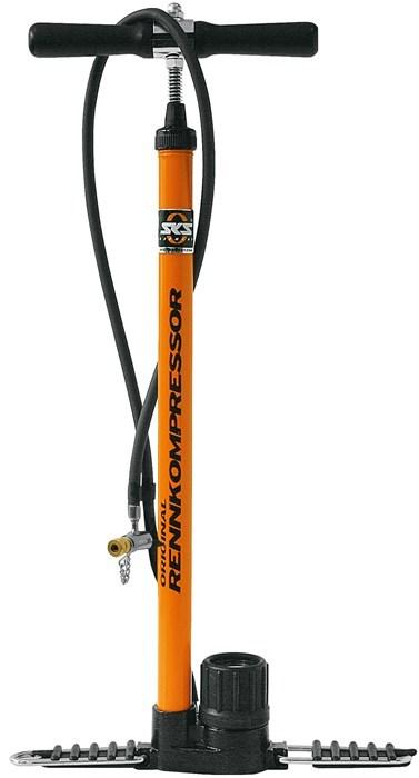 The SKS Rennkompressor Track Pump is a dependable floor pump used by race teams worldwide thanks to the solid design and efficient pump output. The Rennkompressor features a precision gauge for accurately pumping to the required pressure. The pump can reach pressures up to 230 PSI - ideal for clincher and tubular tyres. A solid wood handle and rubber foot grips allow the pump to be stabilised when in operation for quick and easy tyre inflation whilst the extra-long hose allows the pump to be used throughout the workshop or trackside easily. The EVA head automatically adapts for Dunlop, Schrader and Presta valves ensuring the pump is compatible with all popular tyres.