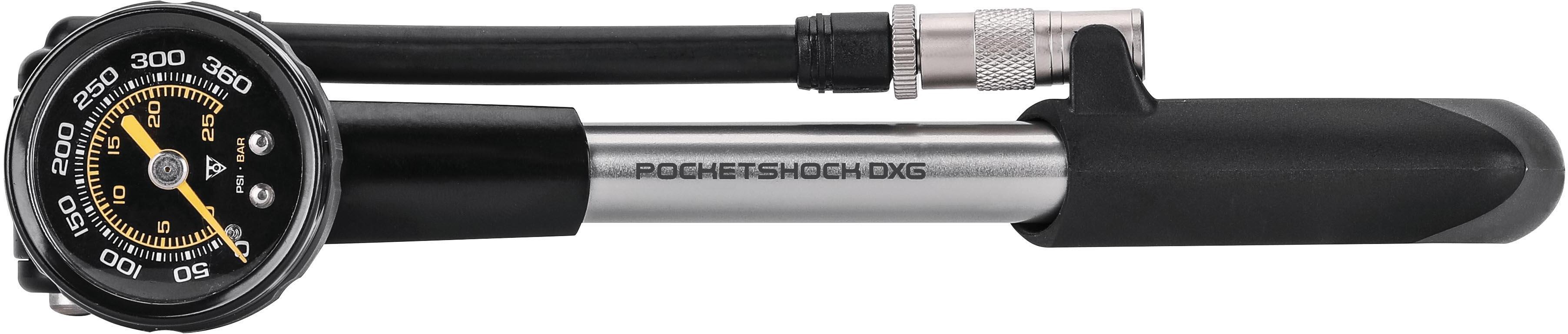 A precision fork and shock pump with an easy-to-read dial gauge for accurate pressure readings up to 360 psi.
