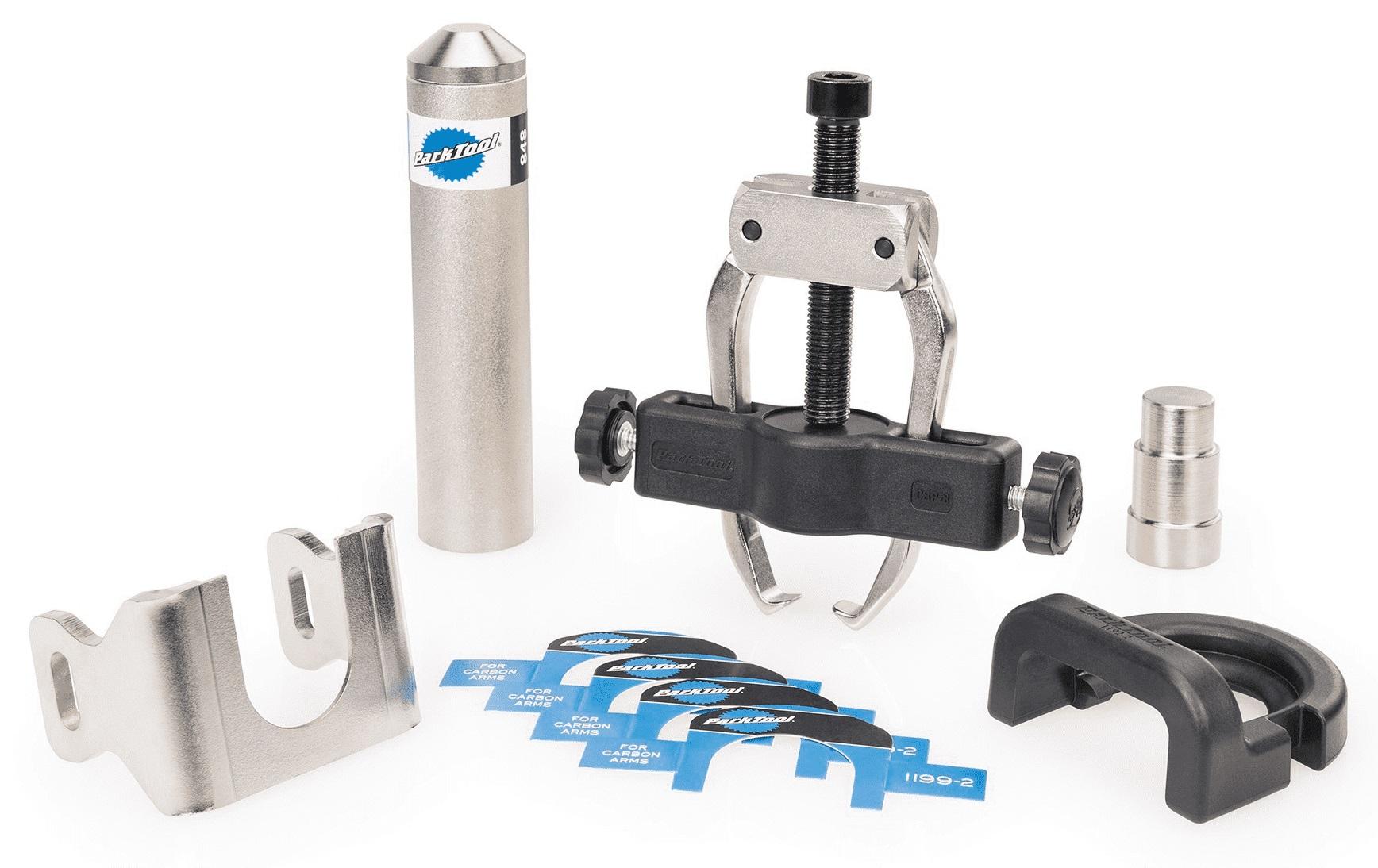 The Park Tool CBP-8 - Campagnolo® Crank And Bearing Tool Set is a complete tool set to work on both Campagnolo & Fulcrum Ultra-Torque and Power Torque crank and bottom bracket systems.  The Park Tool CBP-8 includes a beefed up bearing and crank puller and all the fittings necessary to remove and install both systems.