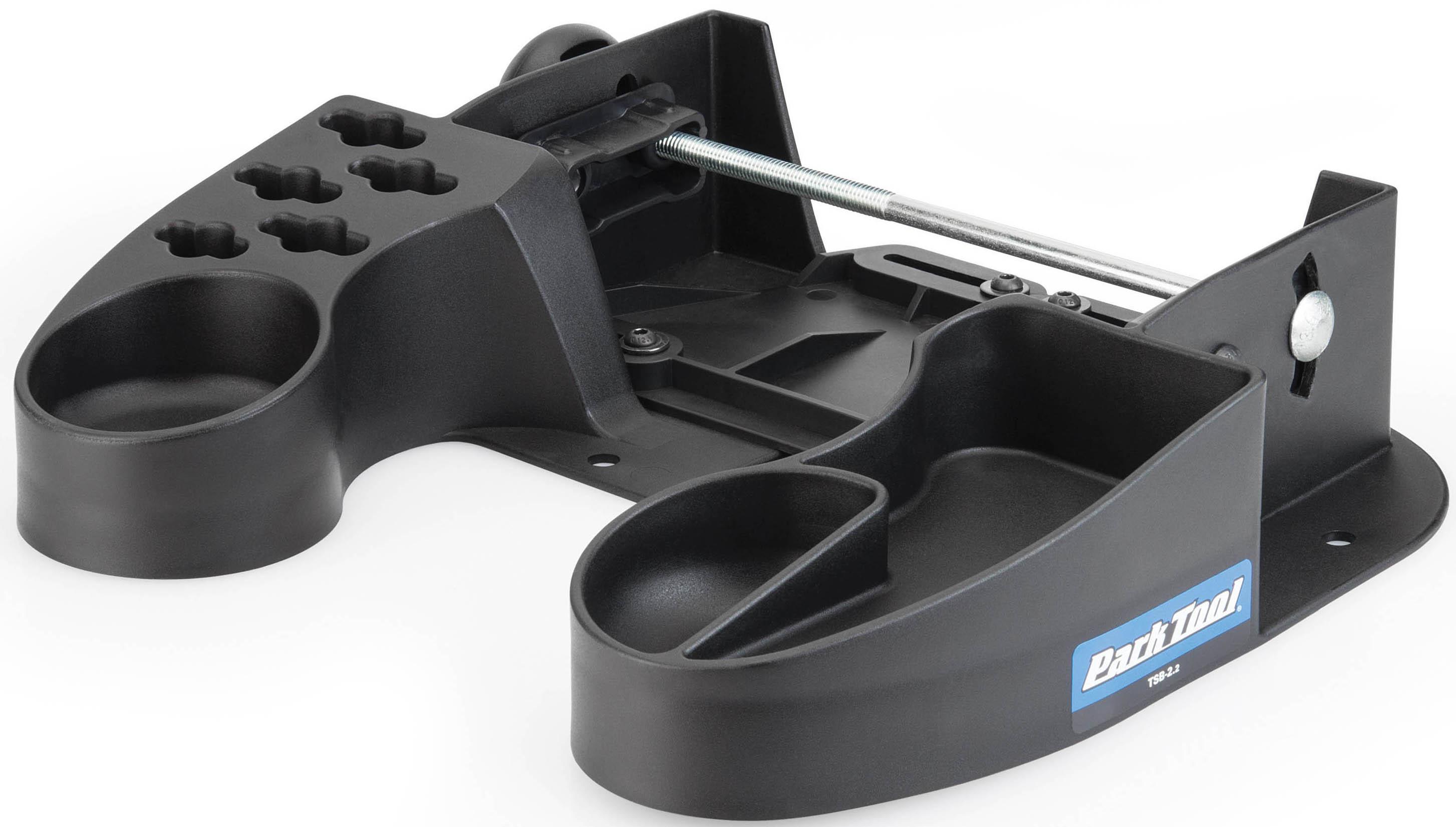 • Features a wide sturdy base, small parts compartments, spoke wrench holders and is constructed of a durable composite material