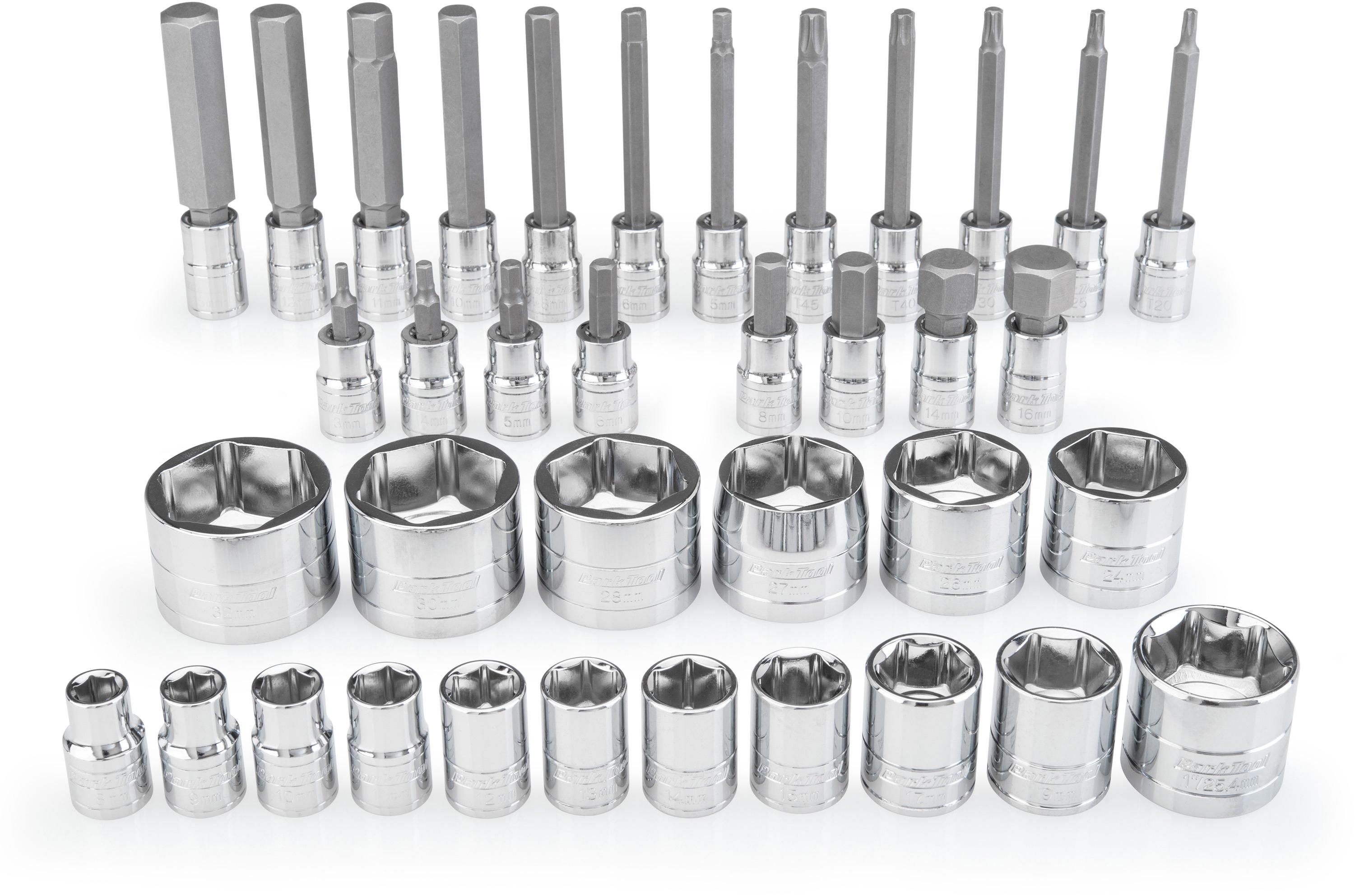 The Park Tool SBS-3 - Socket and Bit Set is a 37 piece, comprehensive, shop quality set of sockets, hex bits and star-shaped (Torx compatible) drivers selected specifically to tackle a wide variety of common bike repair needs, it also includes flat-faced sockets in common sizes for work on suspension forks.