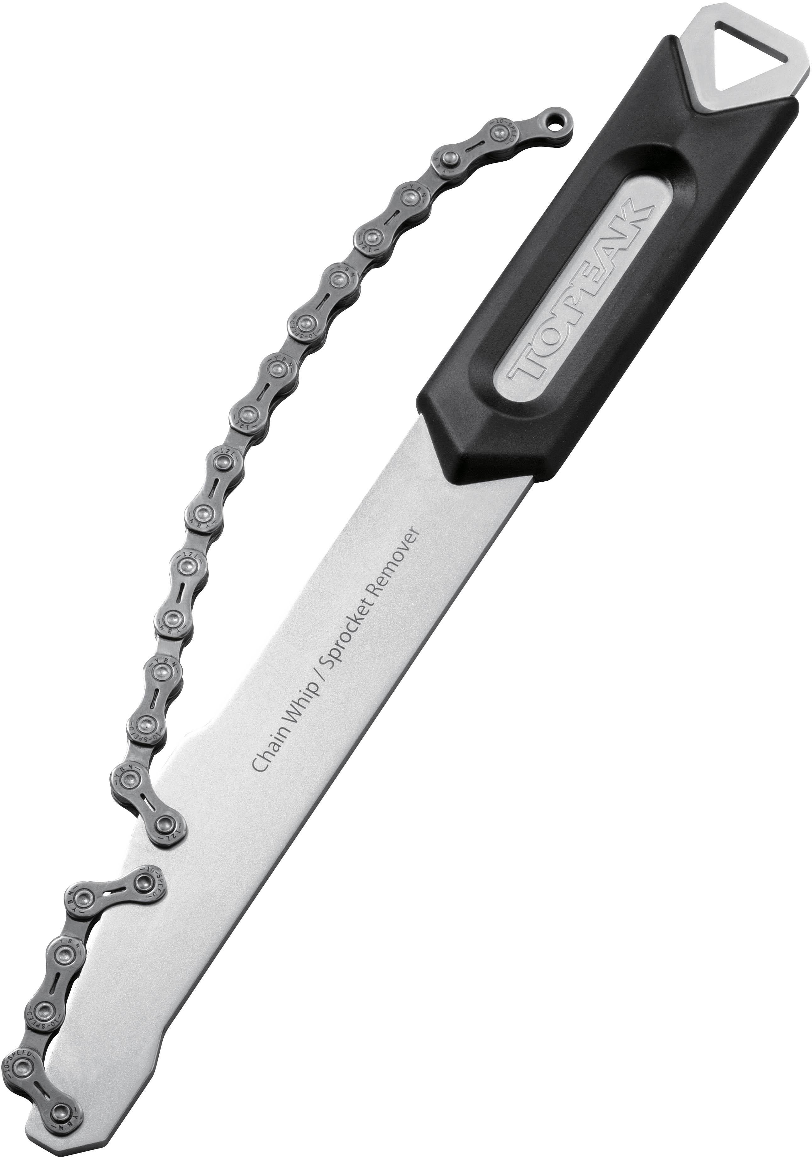 Hardened steel chain whip for rear cassette lockring and freewheel installation and removal. Long padded handle for better leverage and comfortable use.