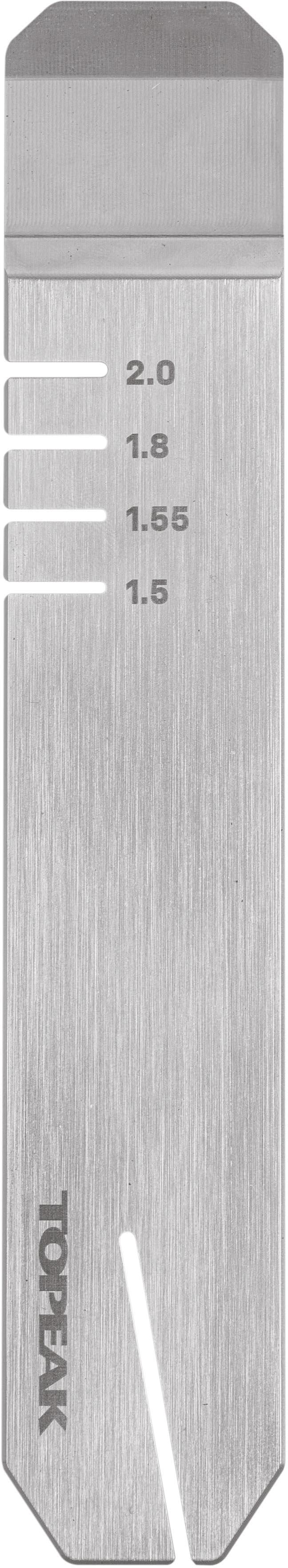 Versatile 3-in-1 bicycle disc brake alignment tool expertly designed for multiple functions. Features include the ability to gently adjust bent disc brake rotors, a front end for spreading pads and compressing hydraulic brake calliper pistons with ease, and an integrated precise gauge on the side for measuring disc rotor thickness. Constructed from high-quality stainless steel for durability and precision.