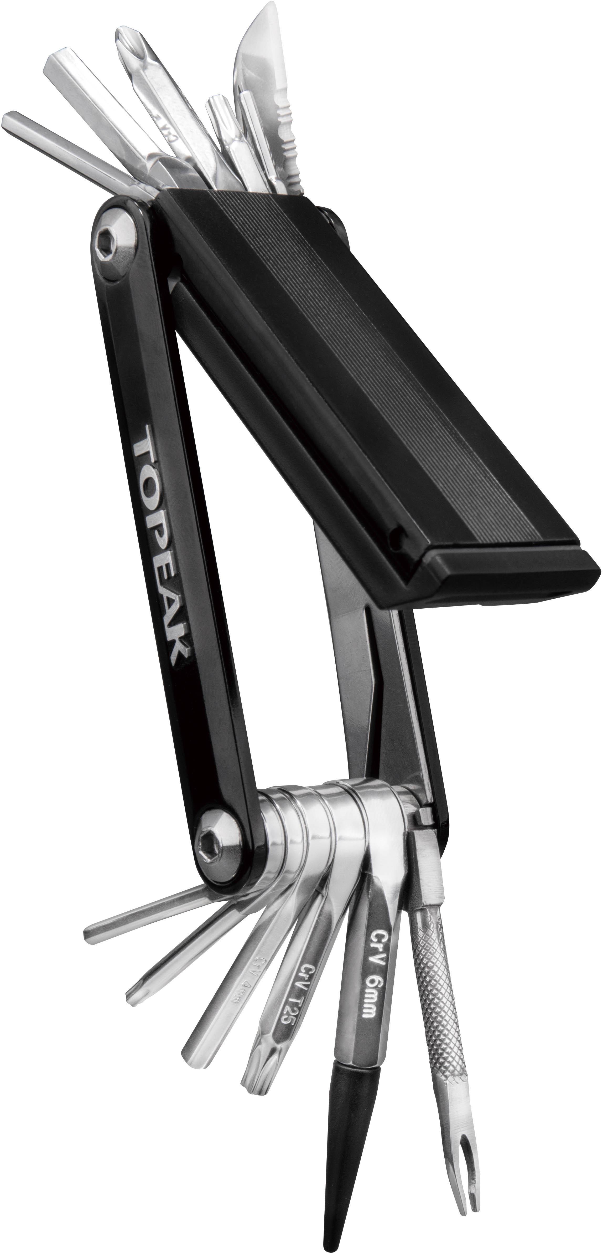 18 function, pro-quality, precision mini tool with integrated tubeless tyre repair functions. Tubeless repair tools and tyre repair plug compartment store inside the tool body for a streamlined profile. Perfect for any road or trailside repair.
