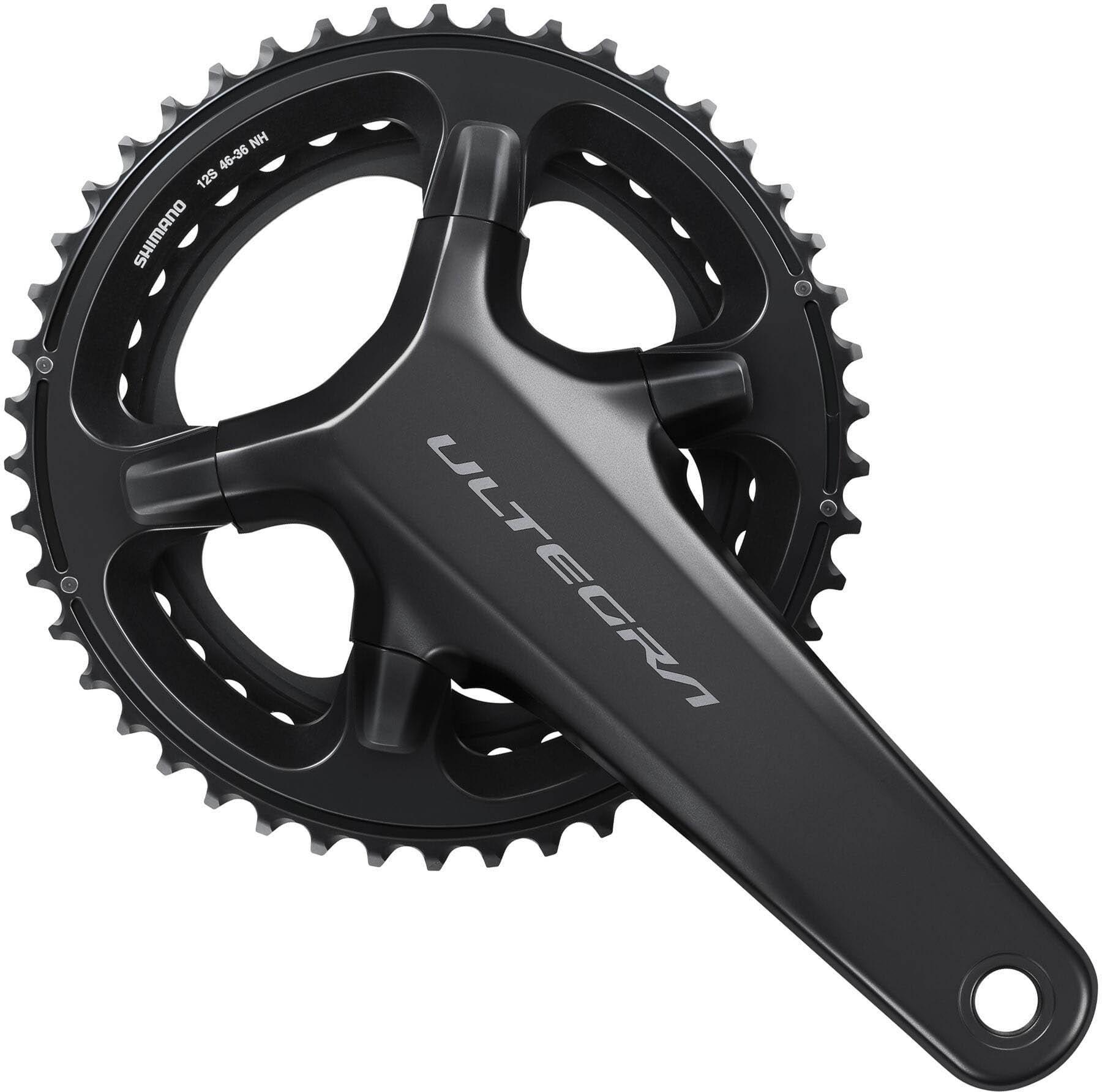 An integral part of Shimano's new 12-speed road lineup, the FC-R8100 crank builds upon Shimano's legendary front shifting and transmission efficiency. With new refinements for seamless 12-speed shifting, the Ultegra 46/36T crank is offered in lengths from 165 to 175 mm to suit all types of rider and riding styles.