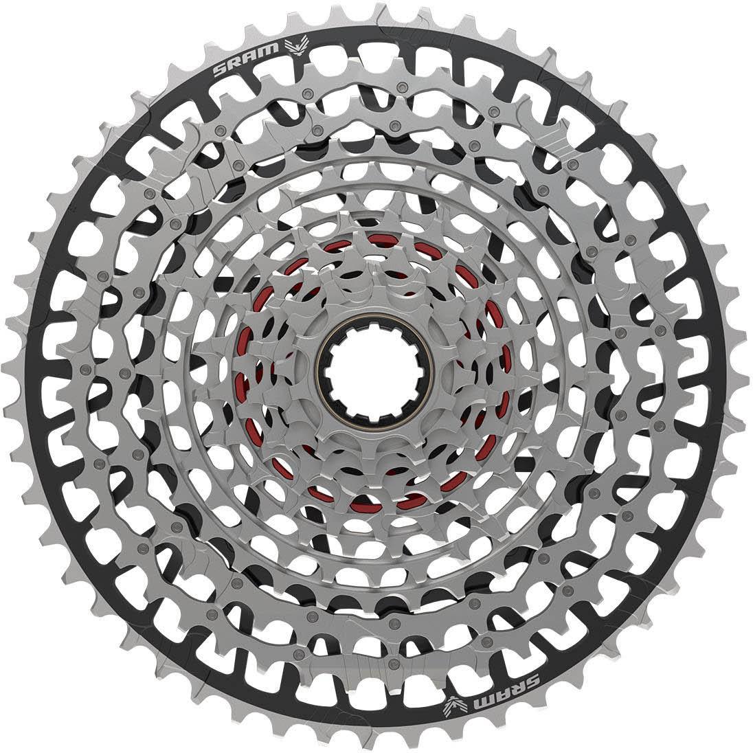 Engineered as integrated and interdependent transmission components, the XX Eagle Transmission Cassette and derailleur contact directly, ensuring perfect alignment on every bike. From its massive 520% gear range, the 52 tooth cog steps down with improved gear progression with 44 and 38 tooth cogs in the low end (compared to the Eagle drivetrain 10-52-tooth cassette). It lasts far longer and delivers more precision with the use of less extreme chain angles throughout the entire range. Featuring a clearly marked Setup Cog, install is both simple and fool-proof. Utilizes hardened tool steel machined X-Dome design for the cluster and stamped steel 38T and 44Tcogs are pinned to the lighter weight aluminium 12th gear. (Spider Cog)