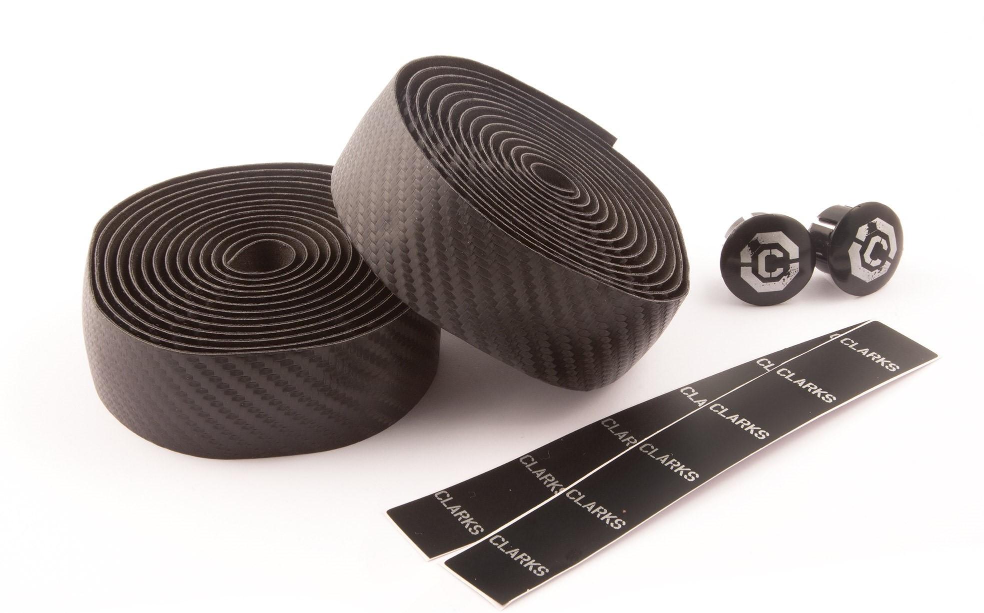 Handle bar tape sets include two rolls of tape, black handle bar end caps, and black finishing tape with a Clarks repeated motif.