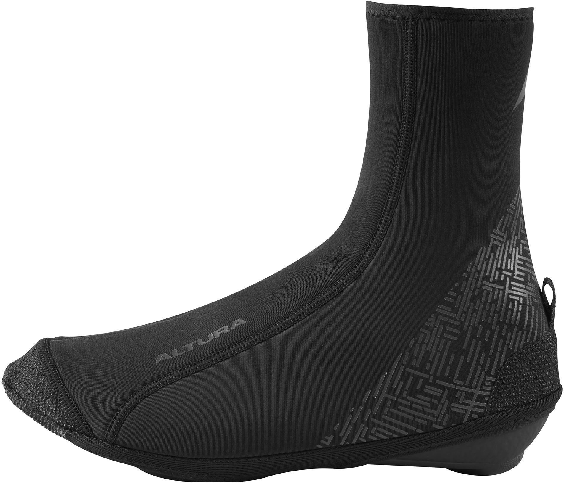 The windproof Altura Thermostretch Overshoes Black are designed for when the weather is doing its best to stop you from getting out on the bike. With its 2.5mm of neoprene these overshoes provide a great warmth to weight ratio and excellent durability too, thanks to the reinforced sole. The strategically placed reflective print will help you be seen in lower light conditions and a handy zip fastener makes it easy to get these fitted overshoes on and off.