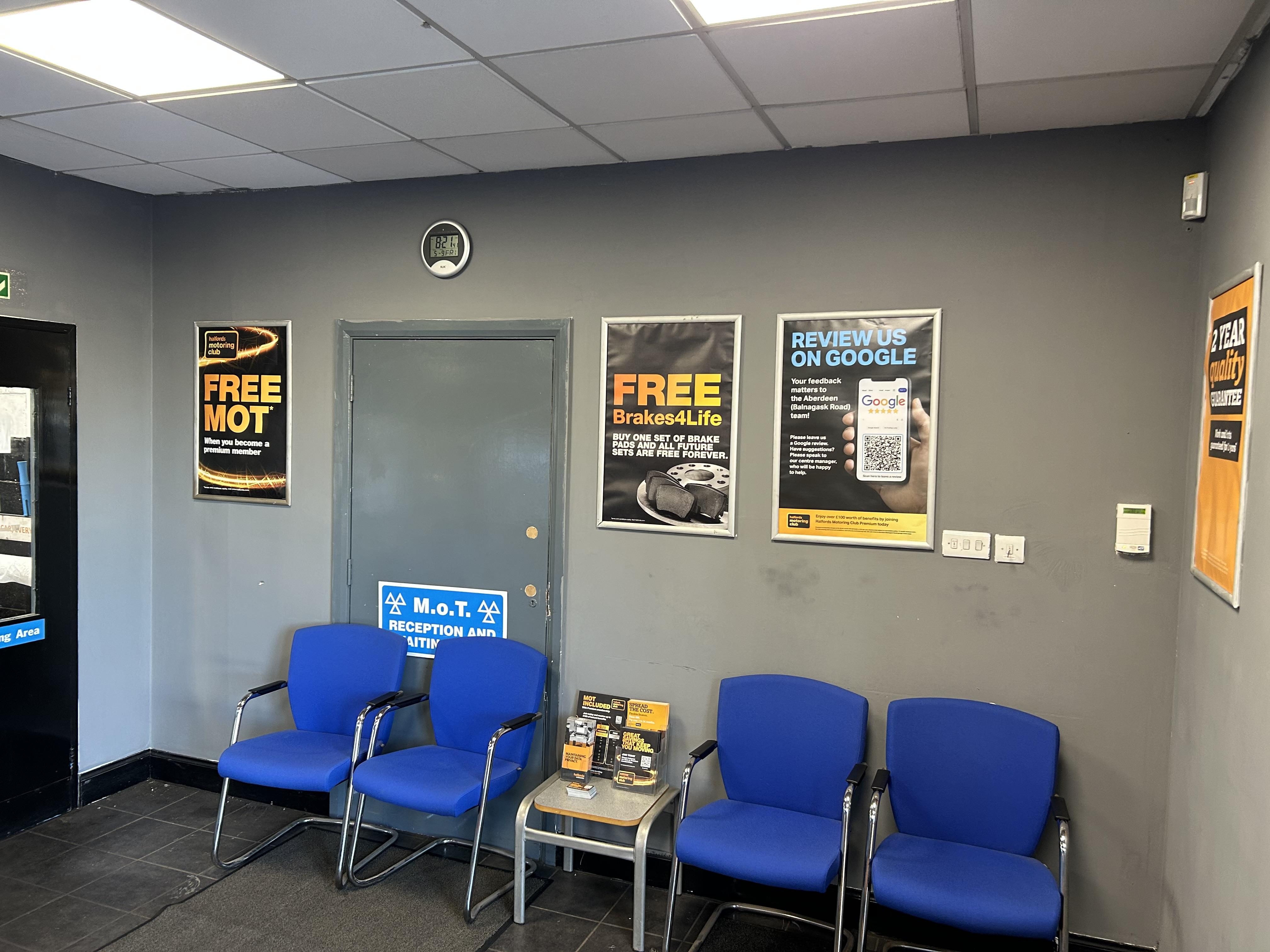 At your Halfords Aberdeen garage, we cover a range of vehicle services including MOT, full, major and interim services, tyres and repairs. Easily book your appointment online or give us a call – we do our best to fit customers in as quickly as possible.Garage facilities