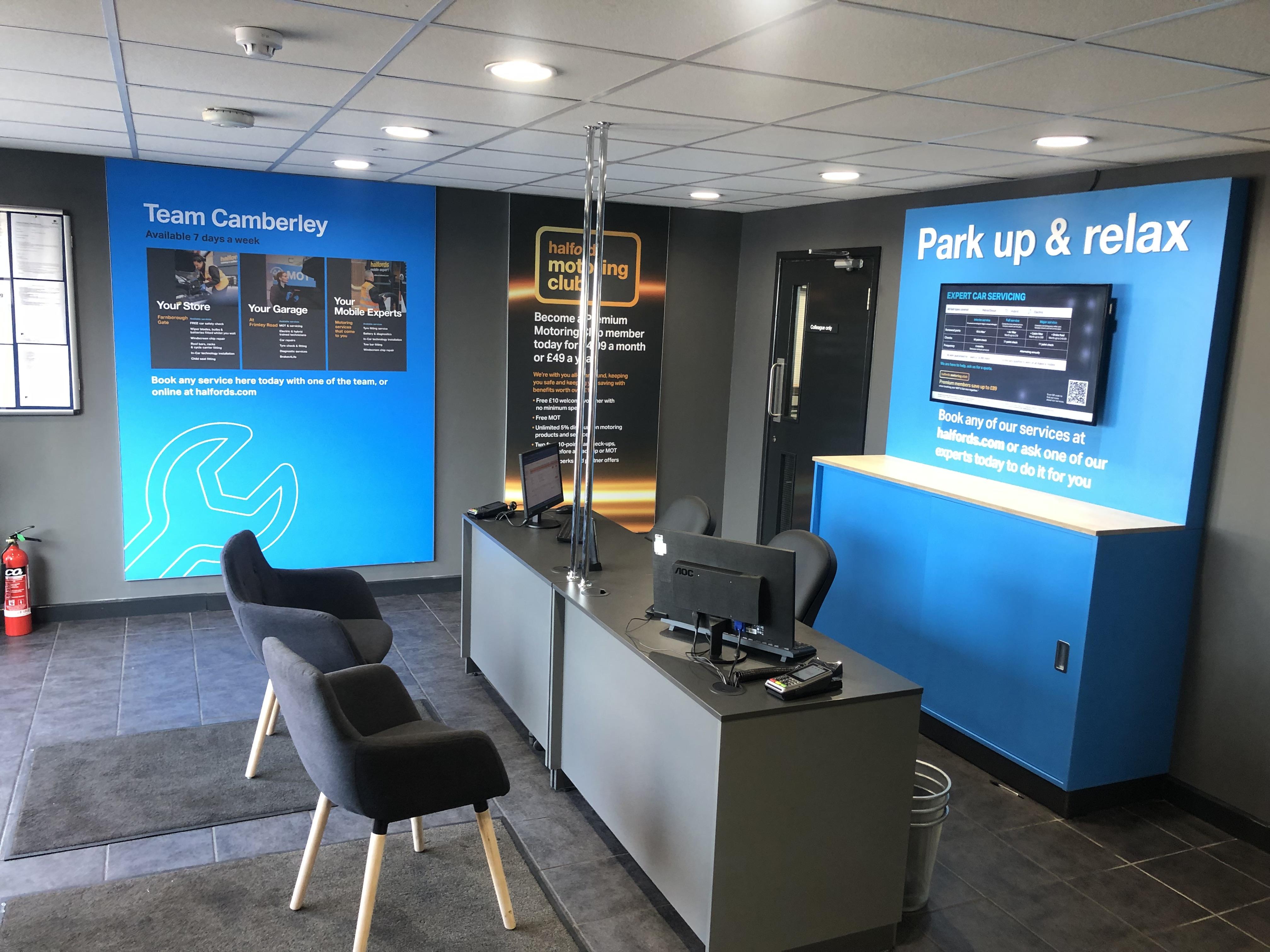 At your Halfords Garage Services Camberley, we offer a range of vehicle services, including MOTs, interim, full and major servicing, tyres and repairs. Appointments can be booked easily online or by phone, and we always do our best to fit customers in as soon as possible.Garage facilities