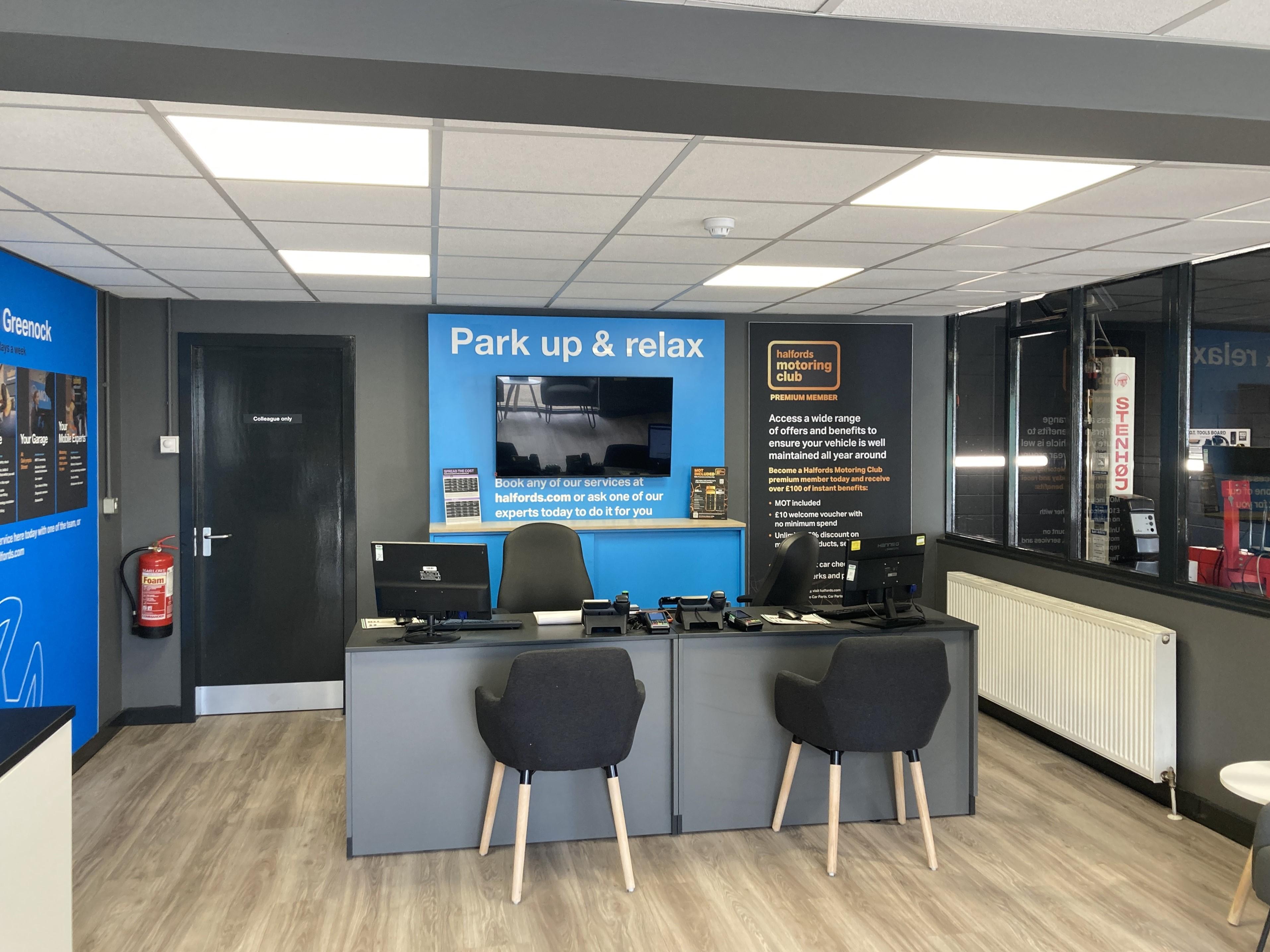 At your Halfords Greenock garage, we cover a range of vehicle services including MOT, full, major and interim services, tyres and repairs. Easily book your appointment online or give us a call. We do our best to fit customers in as quickly as possible.Garage facilities