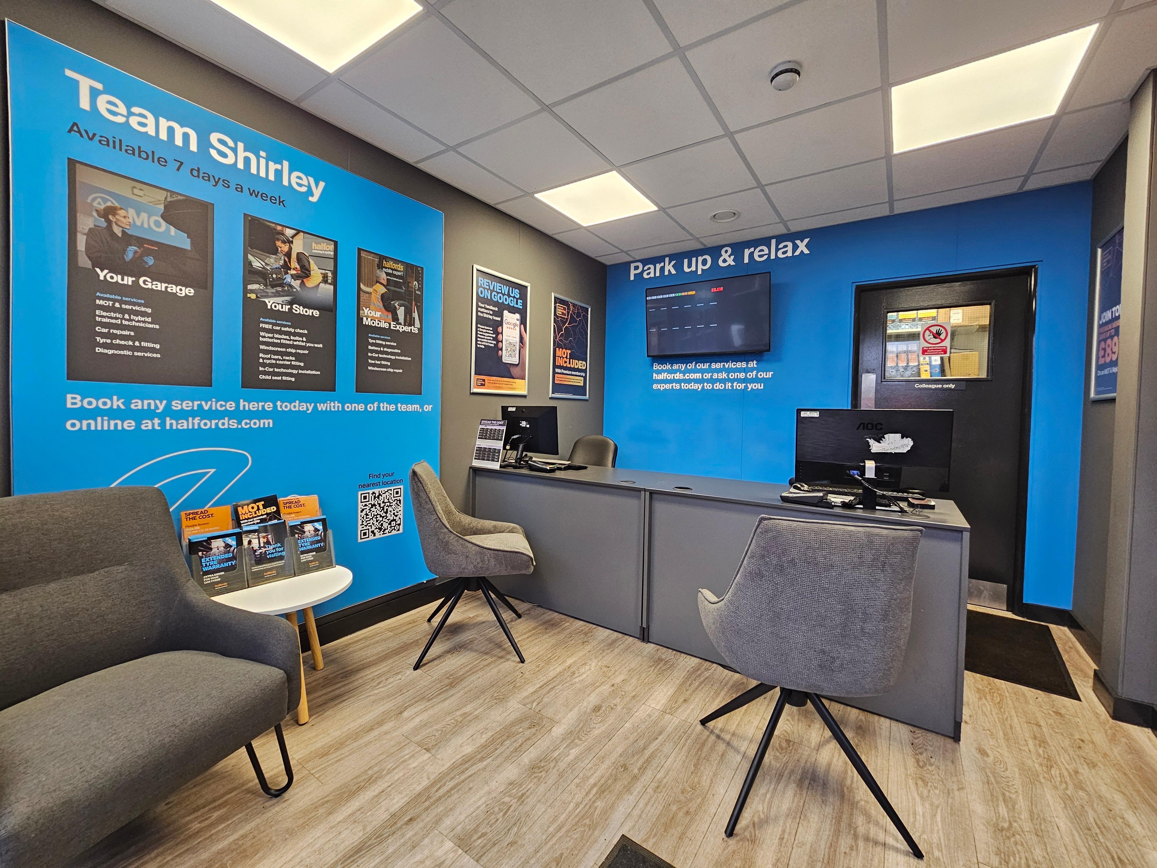 Welcome to Halfords Autocentre Shirley. You can enjoy a great retail experience while the Halfords team gets to work. We can complete MOTs, servicing (all types) repairs and tyre fitting. We can even offer a 10% discount for local retail customers!