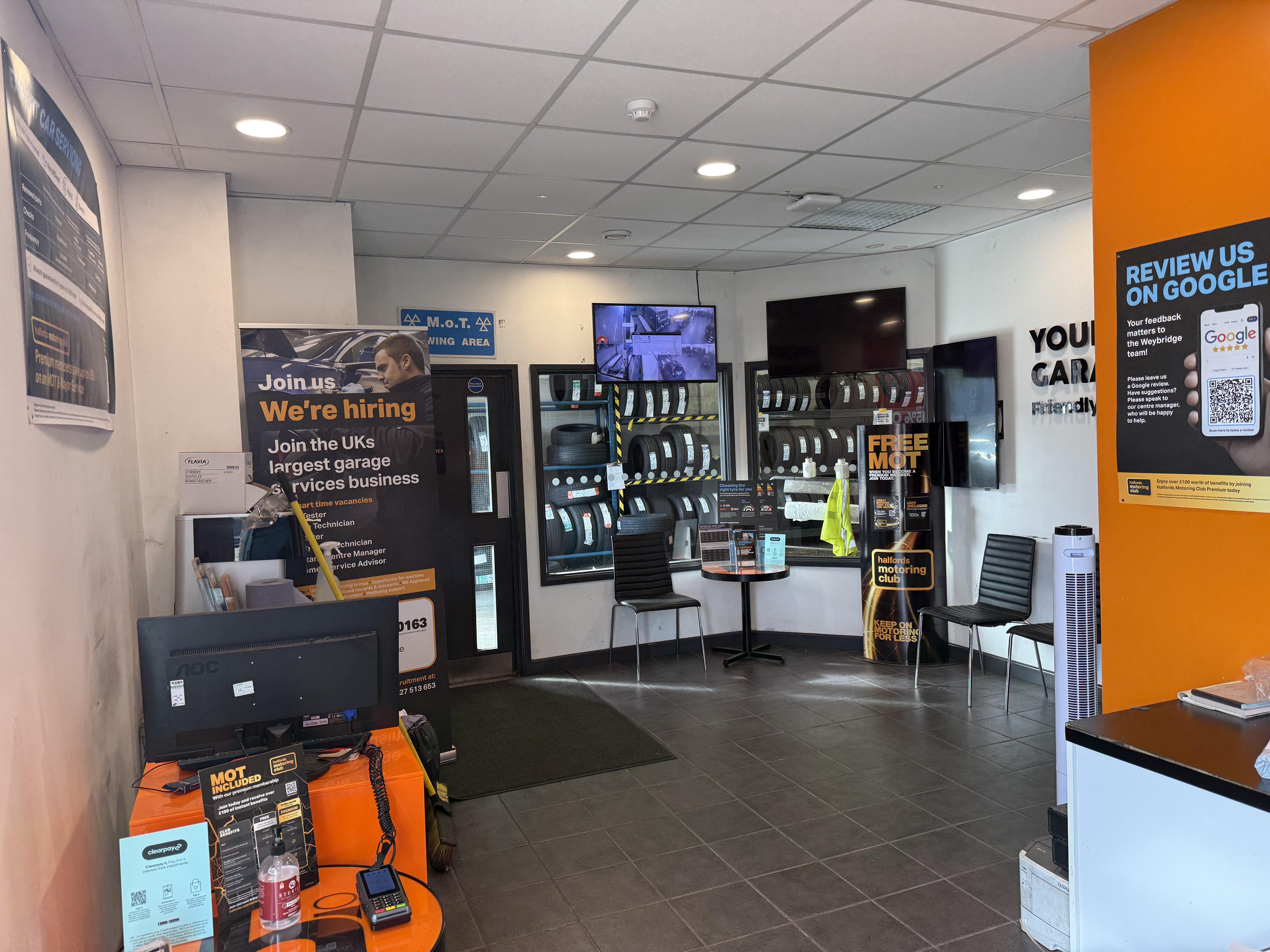 At your Halfords Weybridge garage, we offer a range of vehicle services, including MOTs, interim, full and major servicing, tyres and repairs. Appointments can be booked easily online or by phone, and we always do our best to fit customers in as soon as possible.Garage facilities