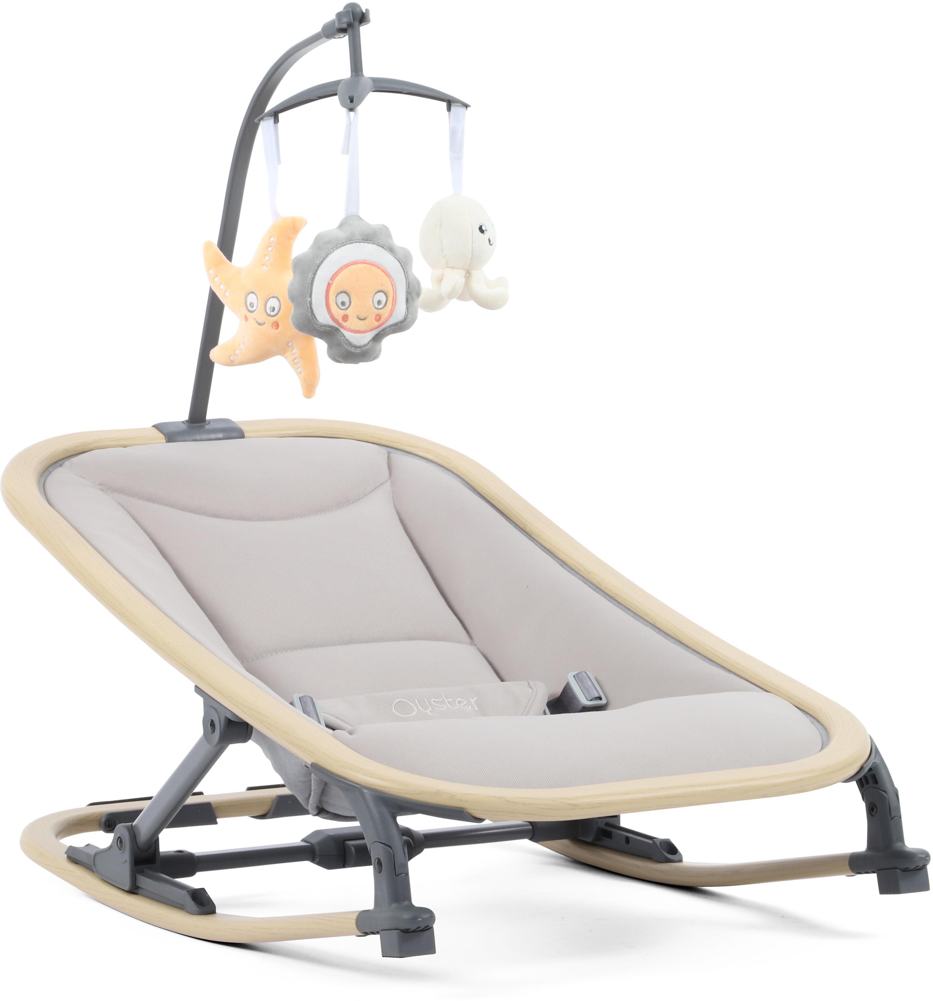 The removable baby mobile encourages baby’s sensory development and play, and is quick to attach or remove for on-the-go convenience. Perfect for travel and holidays, visiting family, or storing at home, the Oyster Rocker folds flat in seconds for ultimate portability.