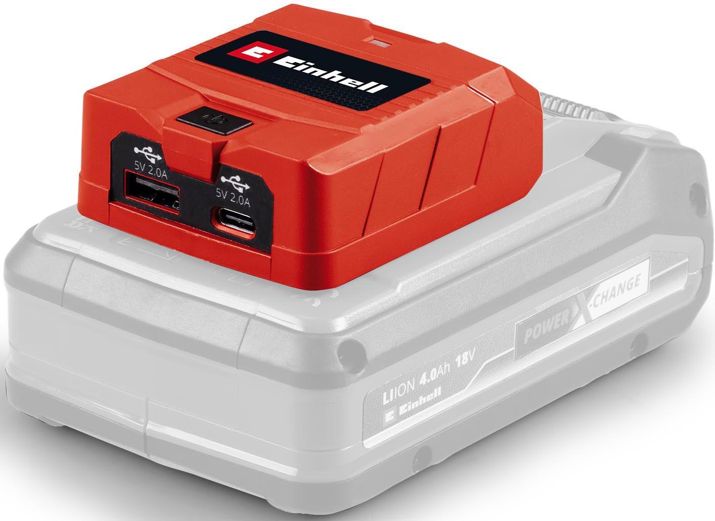 With the Einhell TC-CP 18 Li USB A/C-Solo USB battery adapter and a Power X-Change battery (available separately), you will always have an external power source to hand for mobile devices such as smartphones, tablets and e-book readers. Its two USB ports can be used to charge two devices simultaneously with 2.0 amps each, or to power them with 5 volts. The adapter is equipped with a USB-A port and a USB-C port. An LED indicator on the case of the adapter indicates the operating state at all times. As soon as the battery adapter is switched on via the button and the LED lights up, it can be used to charge or power low-consumption devices. The adapter comes without a battery or charger.