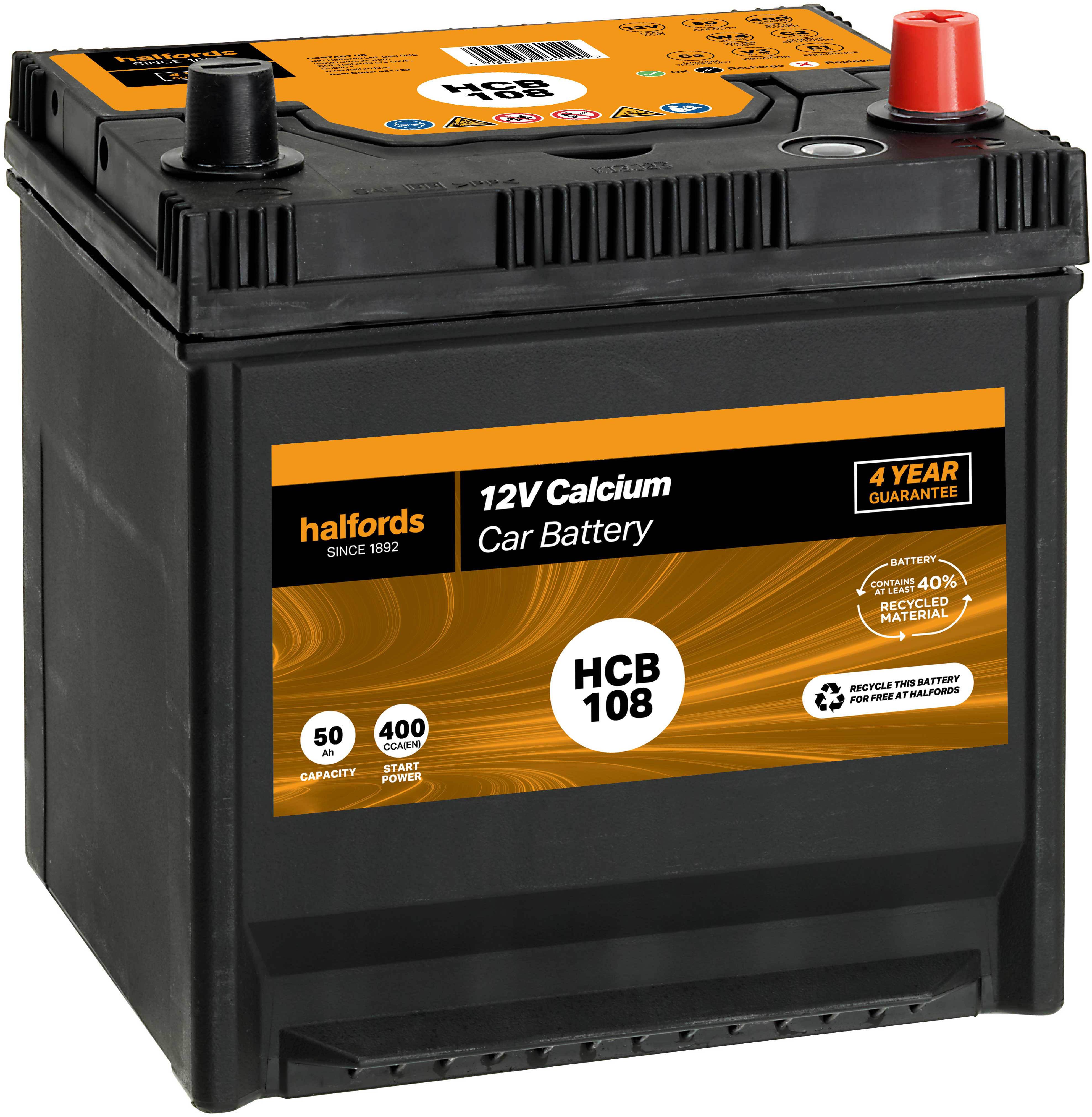 The Halfords HB108/HCB108 Lead Acid 12V Car Battery 4 year Guarantee is a direct replacement for the original equipment battery and gives up to 20,000 engine starts.