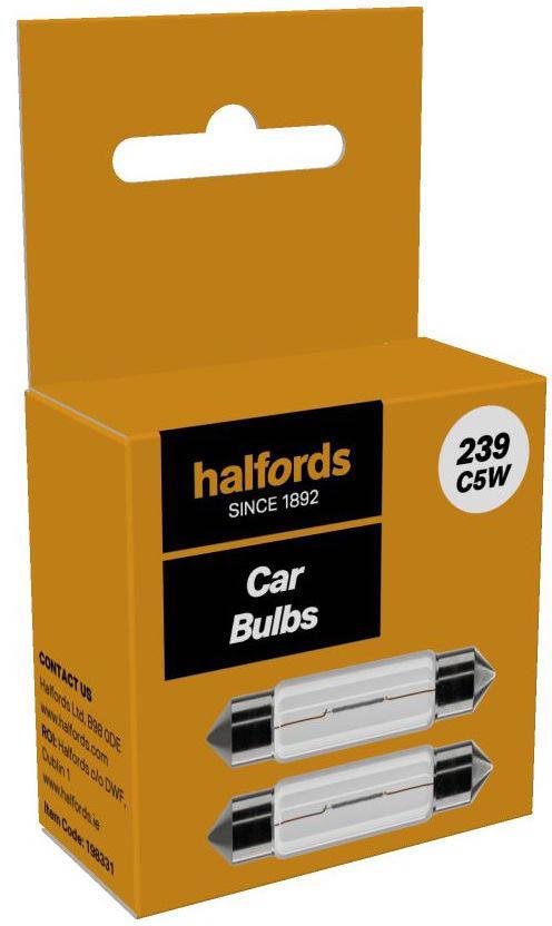 Halfords 239 C5W Car Bulb, developed to ECE regulation 37. Provides reliable performance and light output.  The bulb is suitable for interior or license plate. It’s E-marked for road legal use in the UK and Europe.