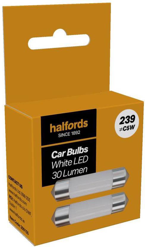 Halfords 239 white LED car bulb. Suitable for interior, number plate or position. Provides reliable performance and light output. Suitable for off-road or interior use only.
