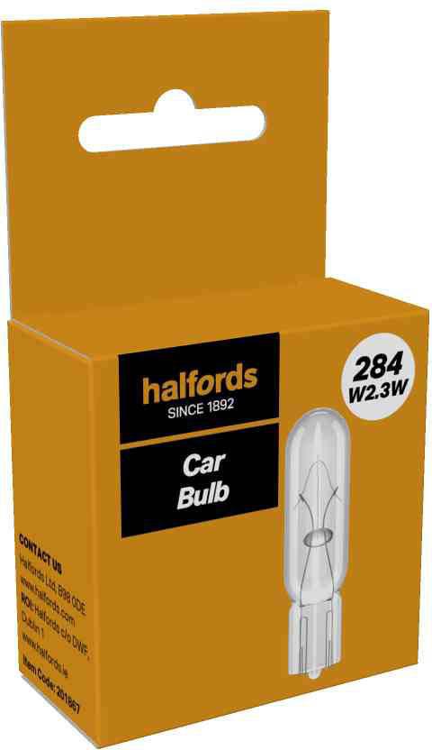 Halfords 284 W2.3W Car Bulb, developed to ECE regulation 37. Provides reliable performance and light output. The bulb is suitable for panel board. It’s E-marked for road legal use in the UK and Europe.