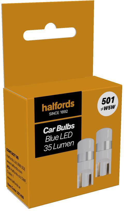 Halfords 501 blue LED car bulb. Suitable for side, tail, panel and interior. Provides reliable performance and light output. Suitable for off-road or interior use only.