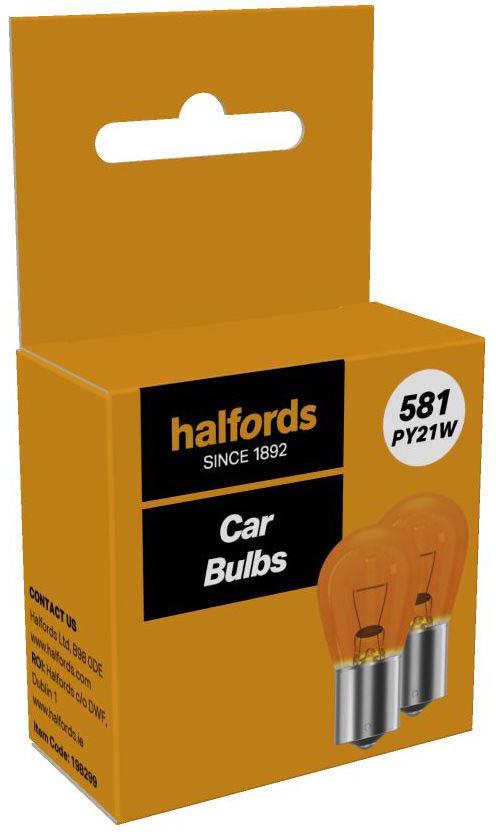 Halfords 581 PY21W Car Bulb, developed to ECE regulation 37. Provides reliable performance and light output.  The bulb is suitable for indicator. It’s E-marked for road legal use in the UK and Europe.