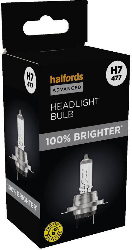 The Halfords Advanced H7 477 Headlight Bulb uses advanced filament technology to produce up to 100% more light with a longer beam pattern than a standard headlight bulb. Upgrade for safer, easier nighttime driving by making it easier to see signs, road markings, and hazards on dark roads.  The bulb is suitable for headlights or fog. It's E-marked for road-legal use in the UK and Europe.