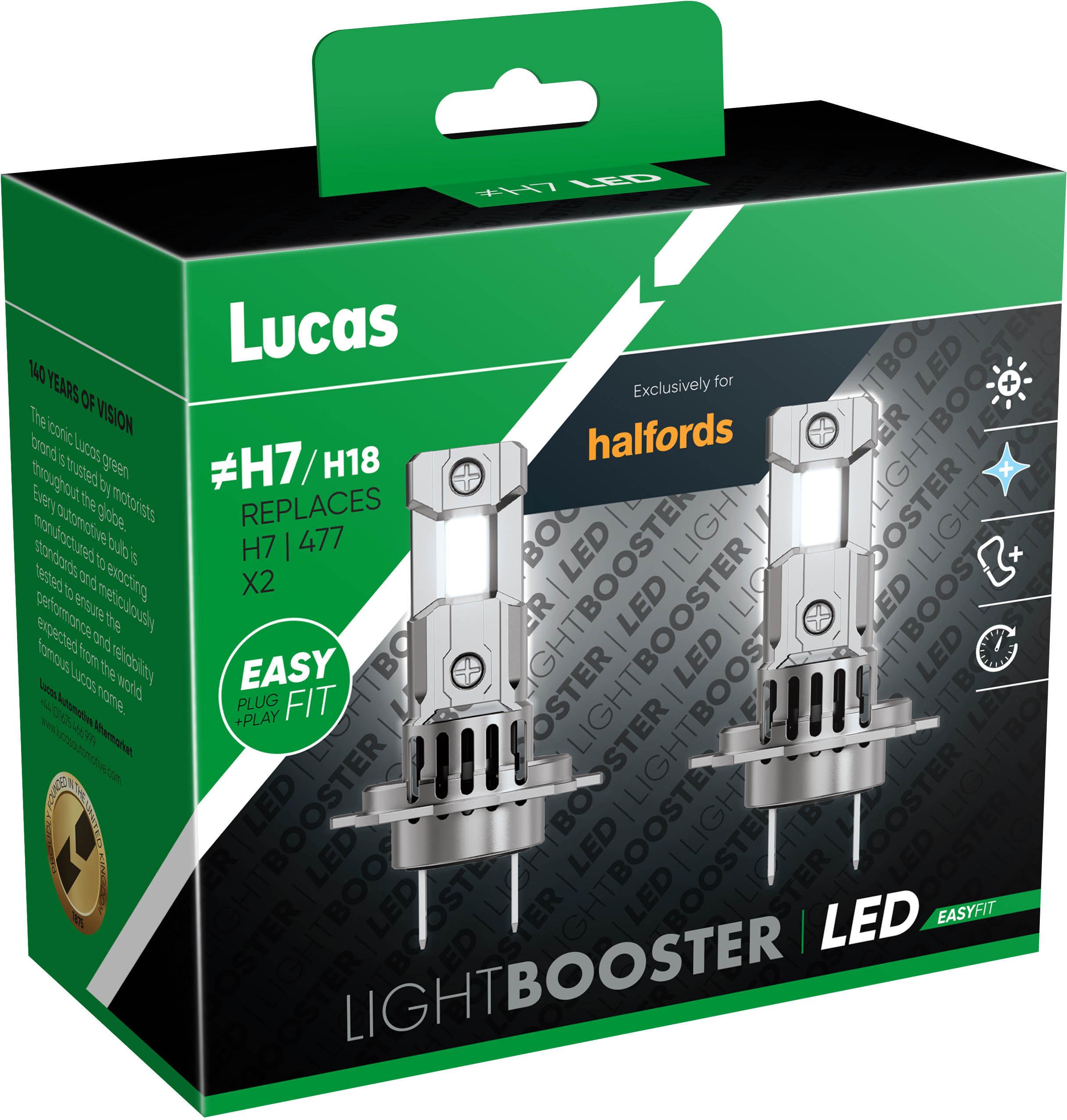 The Lucas H7 477 LED Car Headlight Bulb Twin Pack delivers a precise beam pattern and excellent performance from a globally recognised and trusted brand. With a cool white light for improved vision while driving, the Lucas LIGHTBOOSTER emits more light than its halogen alternative whilst also having a considerably longer lifespan, Keeping the road ahead brighter for longer and  with no rewiring needed and simple Plug-And-Play design this is an easy upgrade for your vehicle. Suitable for off-road or interior use only*.