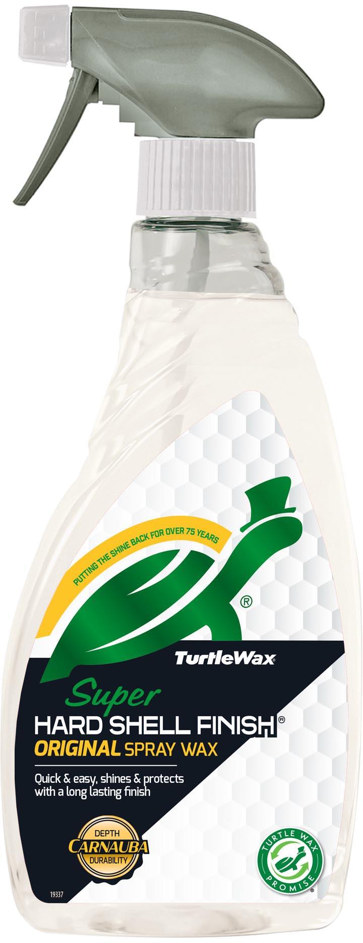 Turtle Wax’s beloved Super Hard Shell Finish wax, now in an easy liquid spray form. Enjoy the long-lasting shine of Carnauba wax and a water-resistant finish that lasts for weeks.