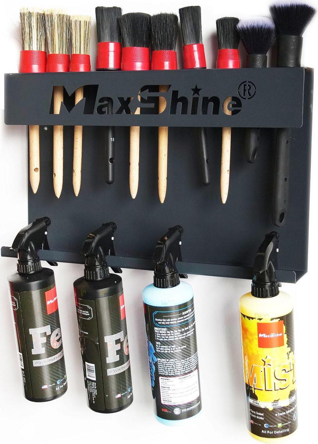 The holder features holes at the top to securely store brushes of varying sizes. The lip at the bottom of the construction allows you to store multiple bottles by hanging them from the trigger.