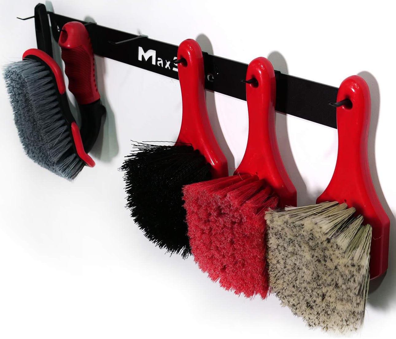 This brush holder features six hooks which are attached to the base/bracket that screws to the wall of your detailing unit, garage or van.