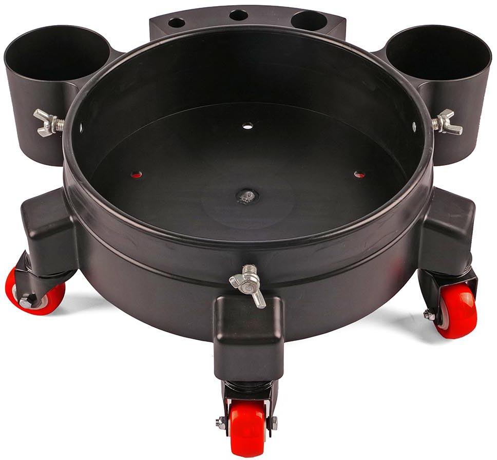 This bucket dolly also features two holders for 16/32 oz bottles and three holes for detailing brushes.
