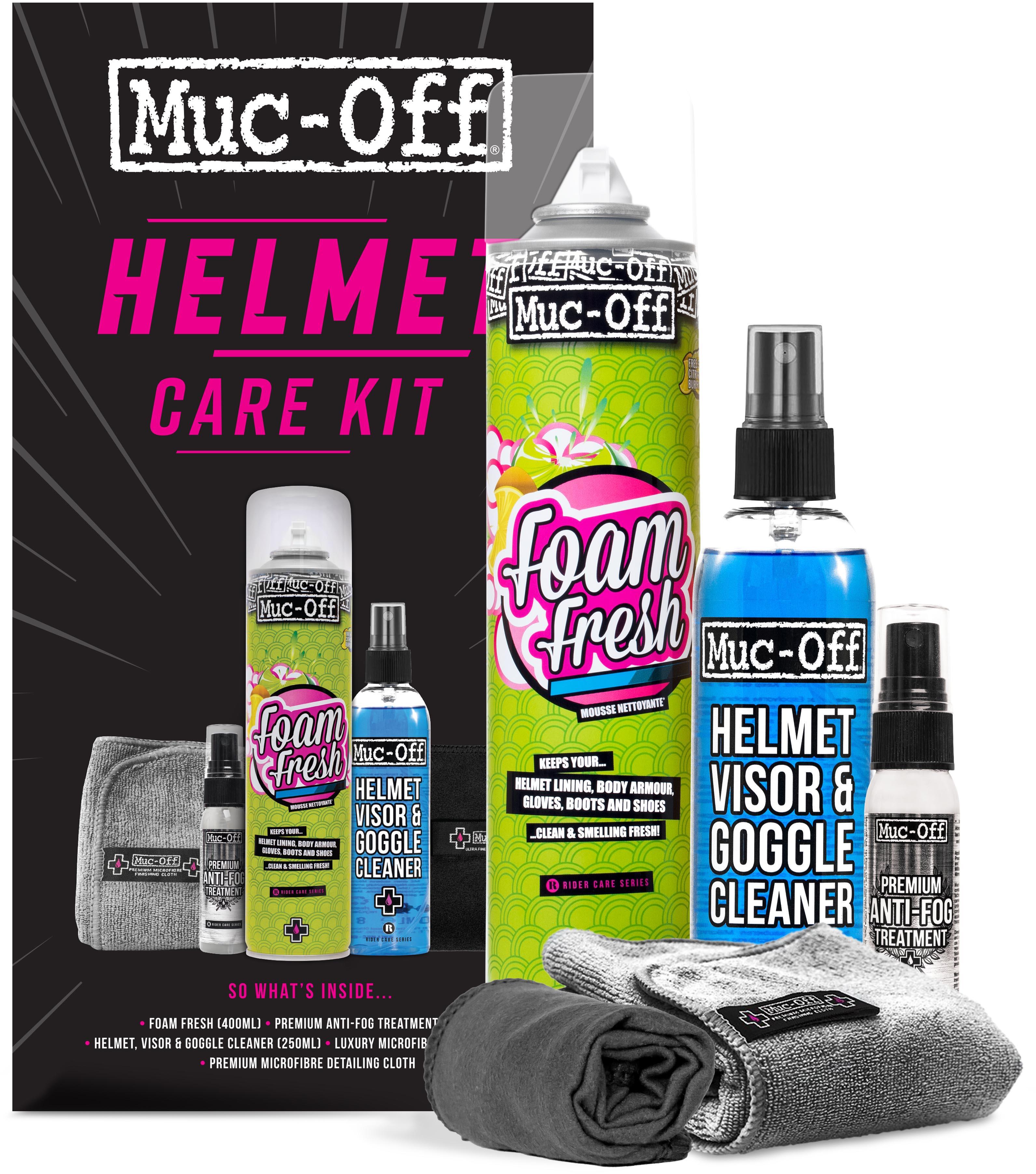 Foam Fresh, Visor Cleaner, Premium Anti-Fog Treatment, Microfibre Cloth and Microfibre Detailing Cloth - all the essentials a rider needs to keep their helmet in top condition throughout the season.