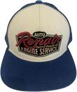 Auto Repair Engine Service Trucker Hat. Embroidered detail. Stone in colour with blue peak and mesh with snapback fastening.