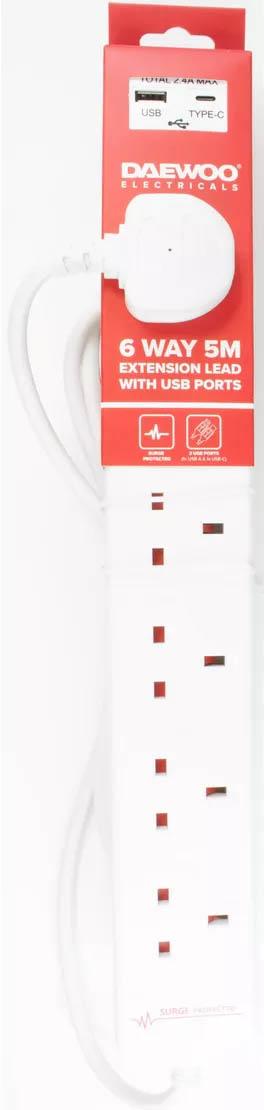 Daewoo 6 Way 5M Extension Lead with USB-A and USB-C Ports