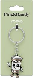 A bright PVC keyring featuring a caffeinated cartoon coffee cup and the words 'Wakey Wakey'.