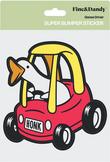 A quirky die-cut sticker of a goose driving a toy car — pure chaos and charm.