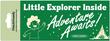 A family-friendly sticker: 'Little Explorer Inside, Adventure Awaits'.