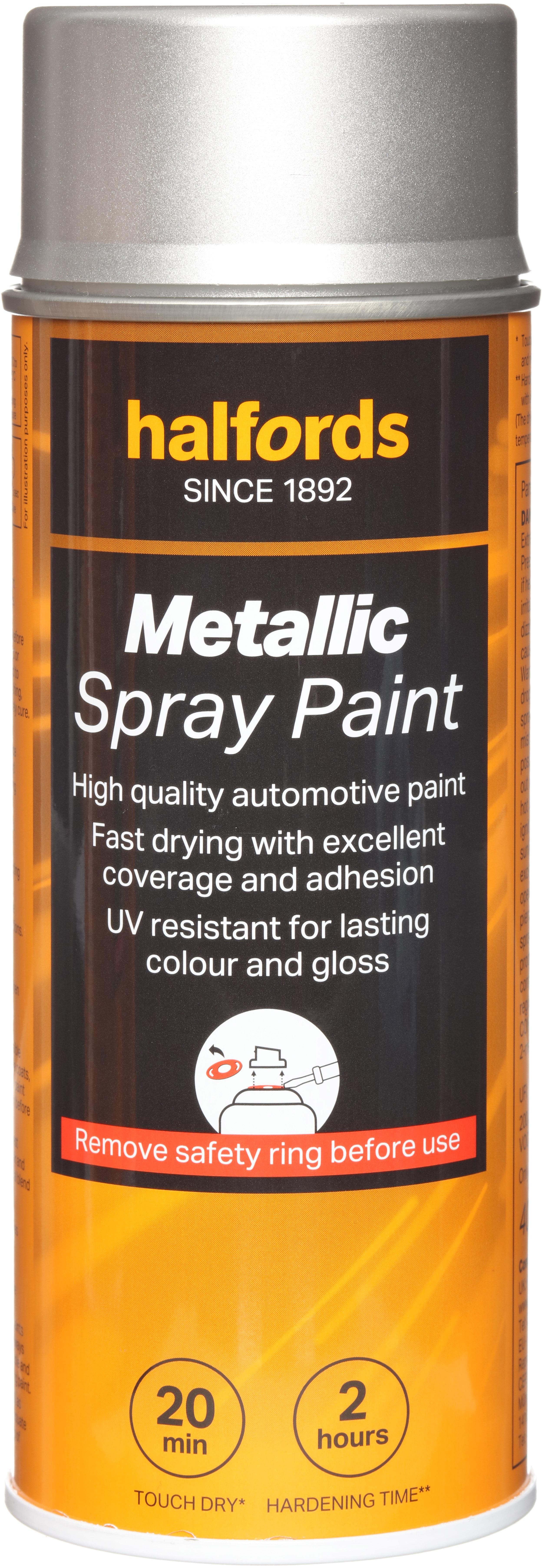 The Halfords Silver Metallic Spray Paint is a multi-use automotive-grade spray paint, which can be safely used on surfaces like steel, aluminium, wood, stone, and most plastics with the right primer.